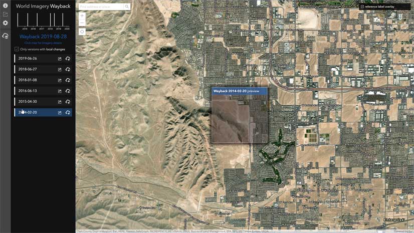 The Wayback App, in ArcGIS Living Atlas, contains every release of the World Imagery basemap archive, including the current release and dating back to the February 2014 release. The application provides discovery, visualization and utility tools that help explore the archive, demonstrate change over time, and access the archive for use across the Esri platform as individual items, layers in web maps, and as tile packages for analysis or offline use.