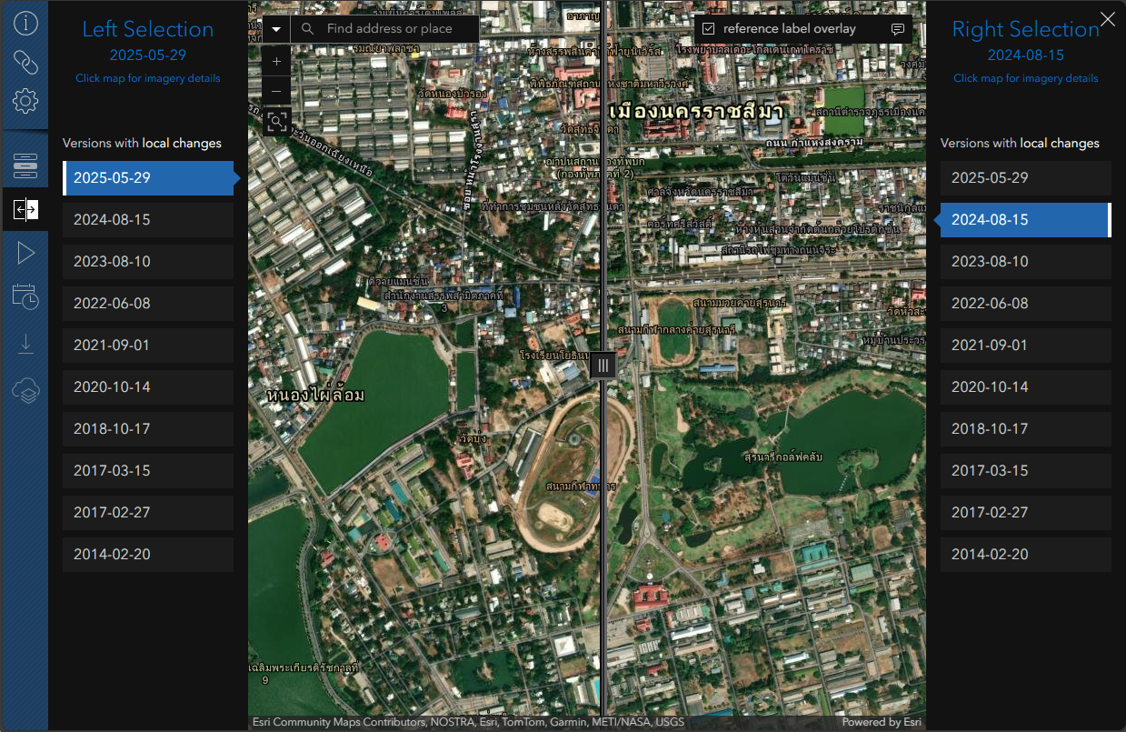 Zooming into the recently updated city of Nakhon Ratchasima in Northeastern Thailand we can leverage existing Wayback App utilities, such as the Swipe Tool, to visualize changes that have occurred on the ground between releases. It looks like the city is in the process of updating a park with new sporting venues, walking paths, and water features.