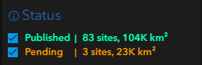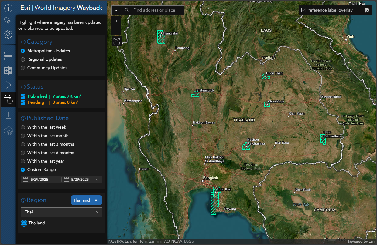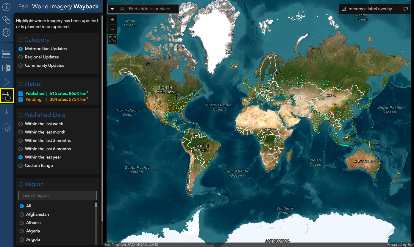 The Updates Mode in the Wayback App lets you explore both pending and published updates to the World Imagery basemap from the past year. Regardless of the publication status, the number of sites and their square kilometer coverage will be summarized based on your selected filters for category, published date, and region.