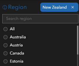 The Region filter is used to focus queries on a specific geographic region. The list of regions changes based on the selections made for imagery category, publication status, and date. Selecting a region will automatically zoom the Wayback Map to your region of interest.