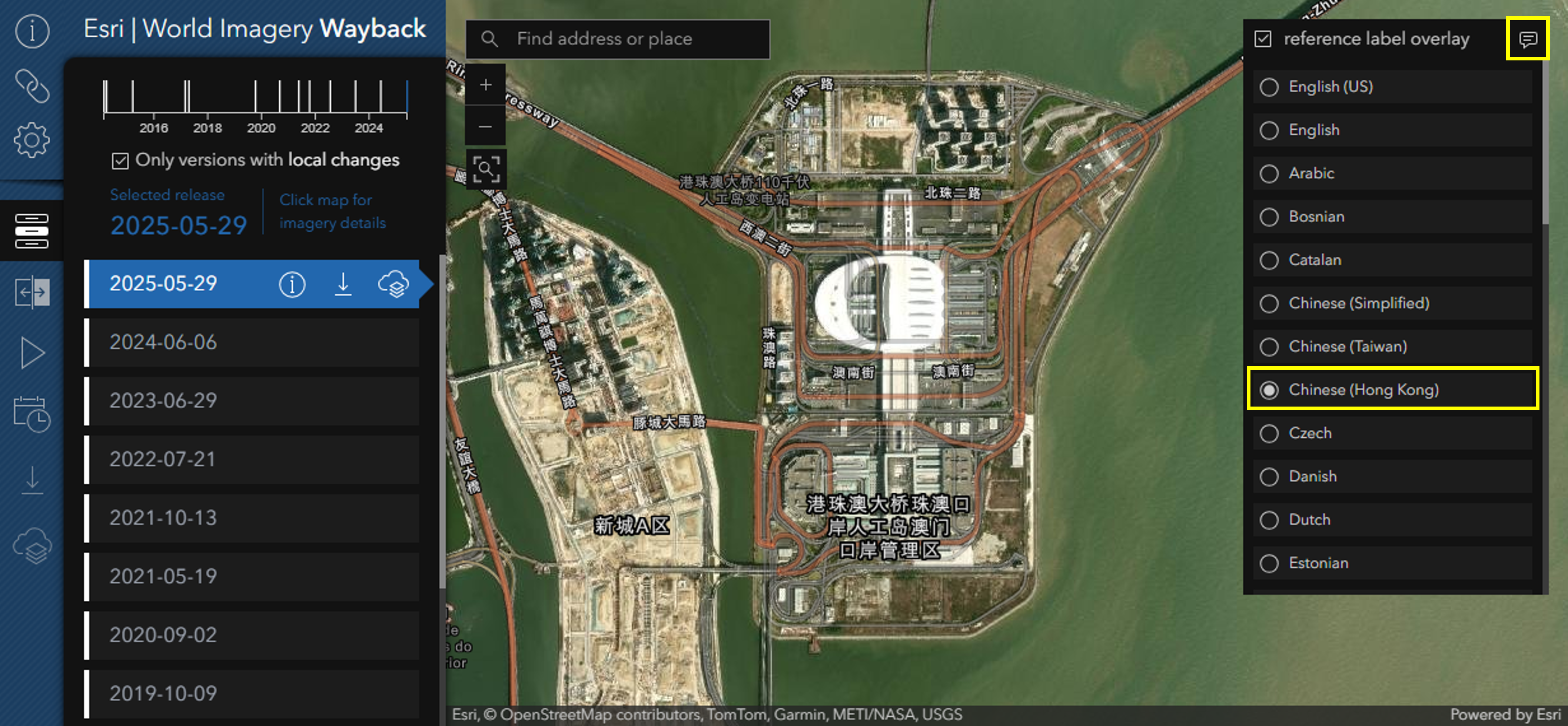 The Wayback App now supports 40 languages for reference labels. To select a language, check the reference label overlay box in the top right corner of the map window, click the text bubble, and use the scroll bar to choose your preferred language.