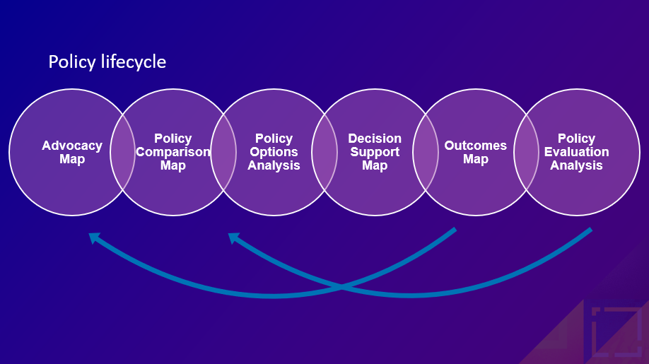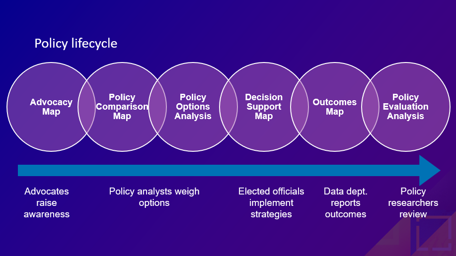 There’s overlap between all the various policy map archetypes discussed here, hence the overlapping circles in the diagram. Furthermore, the cycle repeats. One person’s outcomes map becomes another person’s advocacy map. One organization’s policy evaluation helps inform another organization’s policy options analysis and design. For example, what works, and what doesn’t work, about regulating tobacco and alcohol is now being used to inform policies about regulating vaping, cannabis, and even sugar. An issue can take years, even decades, to move through the policy lifecycle.
