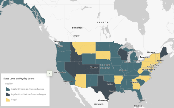 Cartographic tip: Policies are often categorical in nature. Therefore, maps that compare various policies often use the Types (Unique symbols) style. For example, this map shows payday lending laws across states.