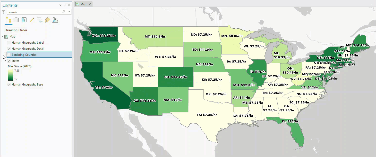 Cartographic tip: Configure labels to help convey lots of information in one map. Here, an Arcade statement combines the state abbreviation and the dollar value into one label.