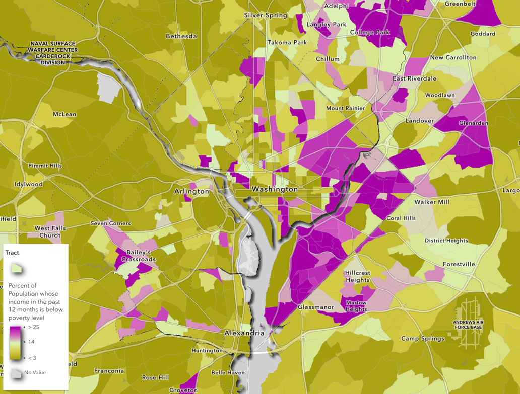 Cartographic tip: Effective advocacy maps often use a diverging color ramp, or the Above and Below theme in ArcGIS Online, to anchor the values being mapped to a goal or to the nationwide average. Many of the diverging color ramps in ArcGIS Online have one color that is very bright, which advocates can use to illuminate areas of interest. For example, the bright magenta areas in the map below show tracts with high levels of poverty.