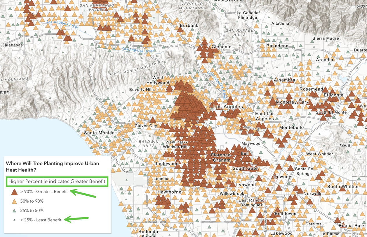 For example, this layer in Living Atlas does both. Its title is, “Where will tree planting improve urban health?” and its legend informs people that higher percentiles indicate higher benefits.