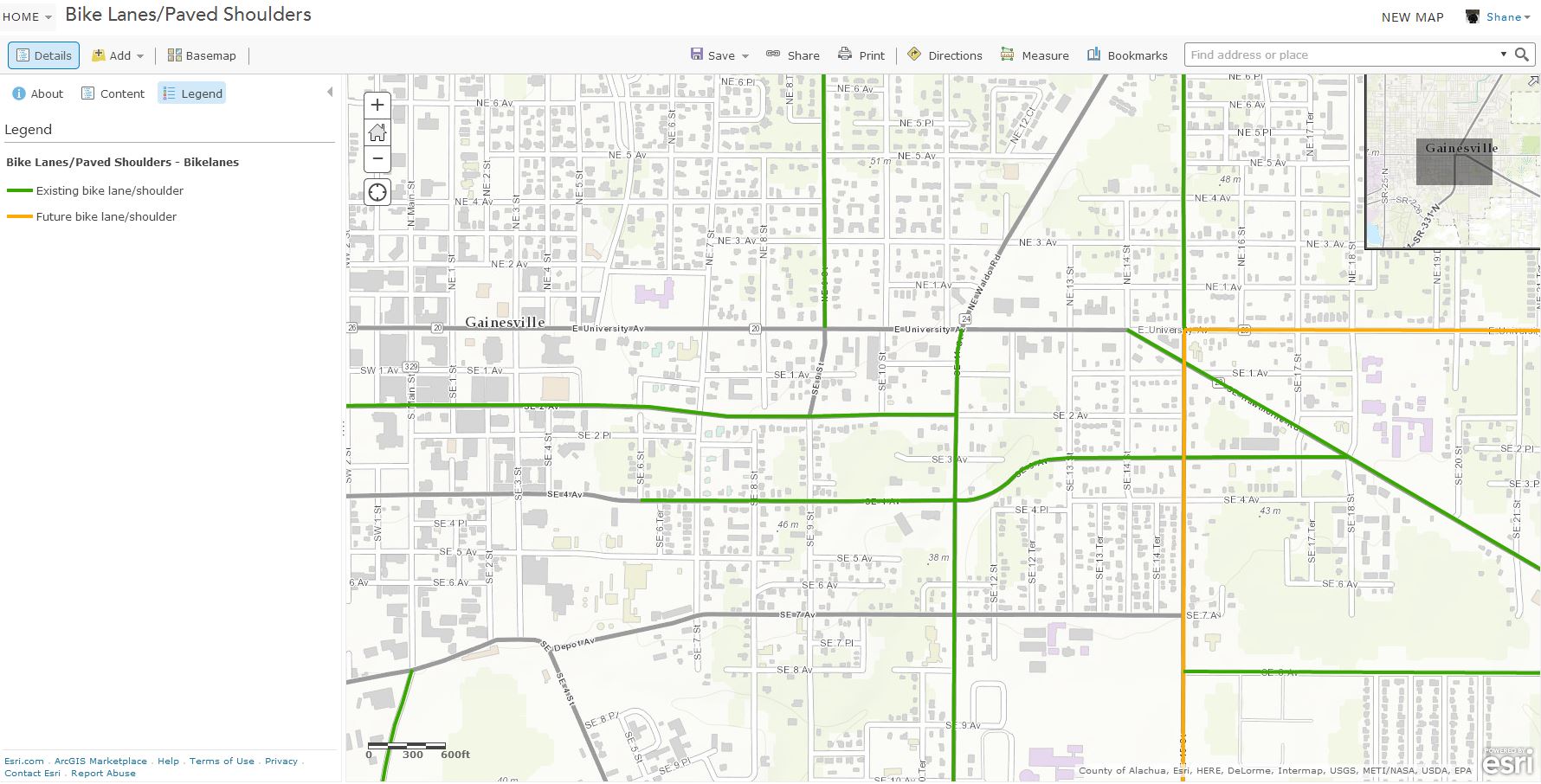 Alachua County Bike Lanes and Paved Shoulders This data set contains roadways having bike lanes or shoulders accommodating to bicycle traffic, or designated for improvements including adding bike lanes. This data set corresponds with the existing and future bike lanes in the map “Bike/Pedestrian Existing & Future Network” which is part of the Transportation Mobility Element in the Alachua County Comprehensive Plan.