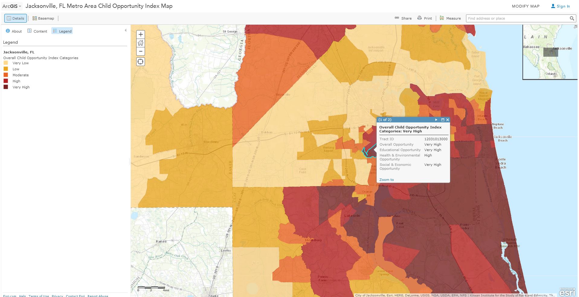 This is a good example of applied use of demographic content. Jacksonville can use this information in the context of their contributed basemap data. The Child Opportunity Index is calculated based on Education, Health & Built Environment and Neighborhood Social & Economic Opportunity indicators.