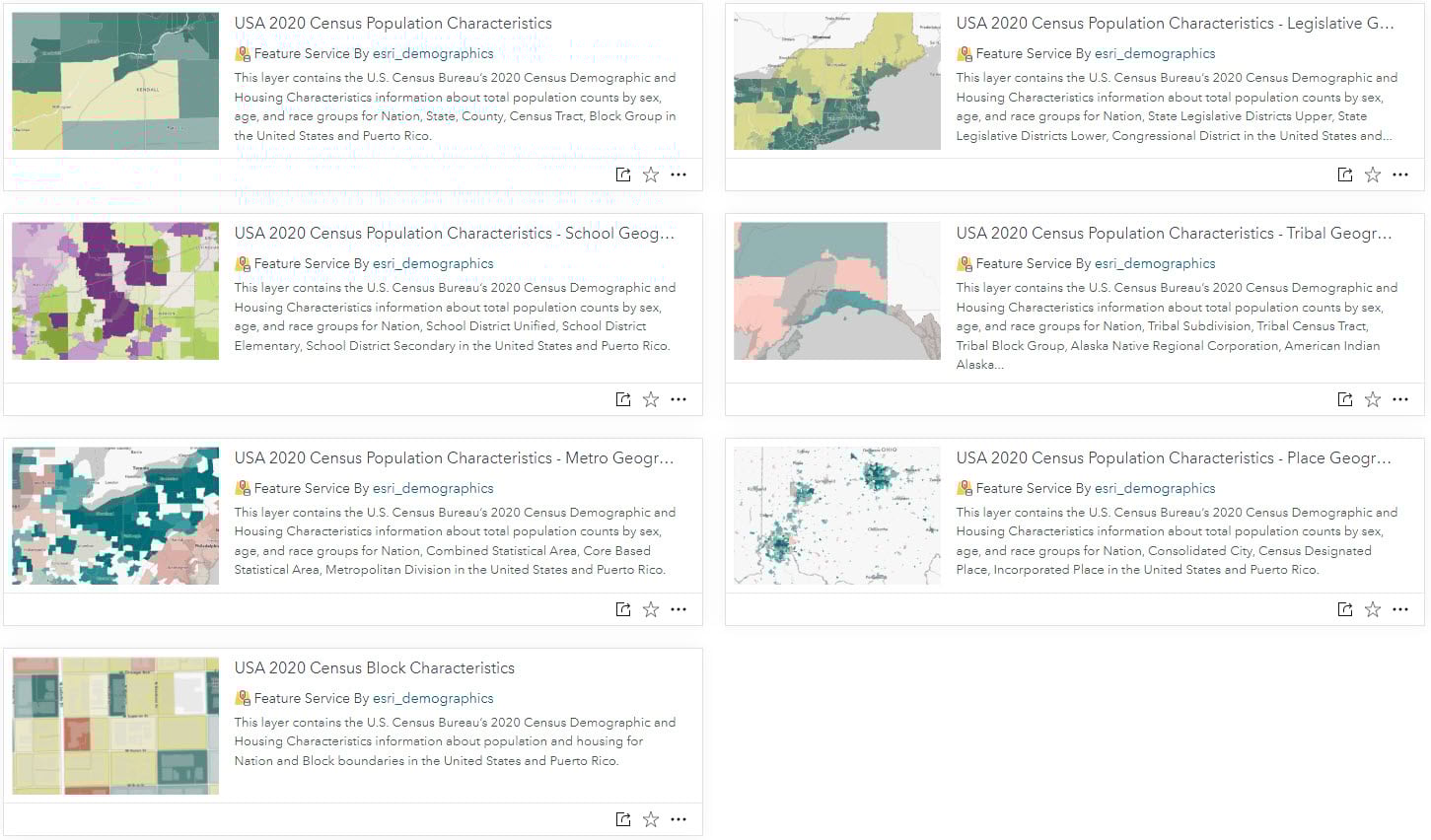 Of course you can also check by searching Living Atlas when working in ArcGIS Online or in ArcGIS Pro. ArcGIS Living Atlas is designed to support GIS analysts by having the content you need to jumpstart your workflows. If there is a specific DHC table or attribute you need for your work, let us know on Esri Community’s Living Atlas space. Post/answer questions and share with other GIS analysts how you’re mapping this once-in-a-decade dataset.