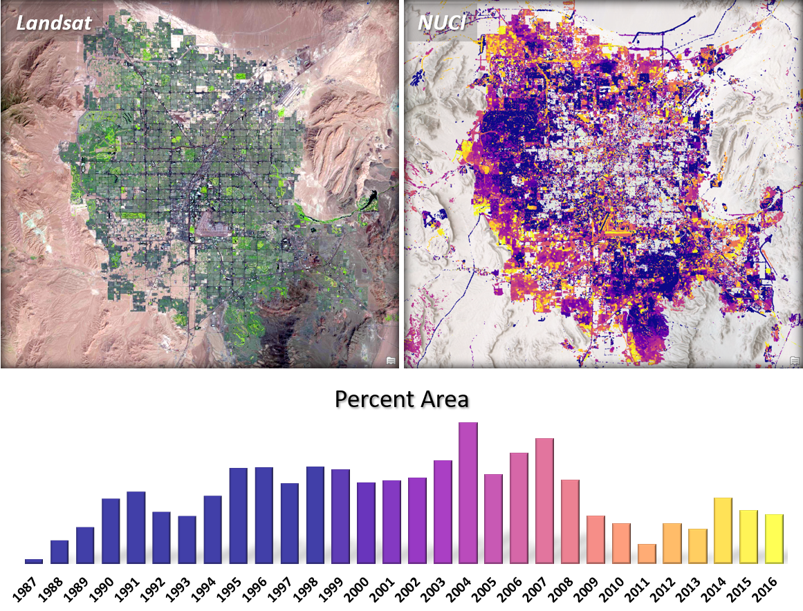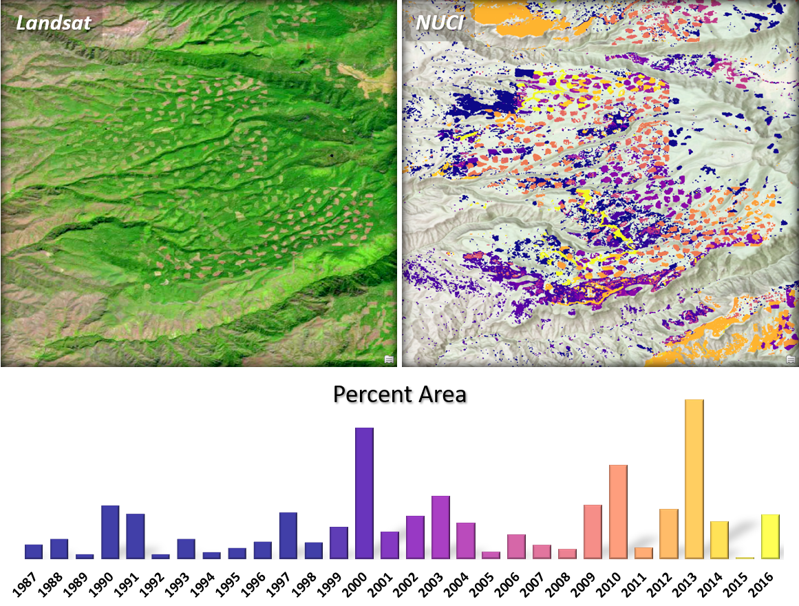 With traditional image-to-image change detection methods, distinguishing among spurious, seasonal, and persisted changes can be difficult and time consuming. With NUCI, all of the work has been done for you. Over 13,000 multi-temporal Landsat images were analyzed, and the results filtered, enabling you to readily focus on thirty years of persistent land cover changes.