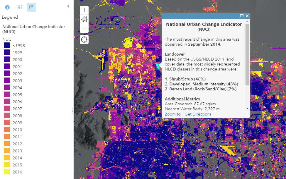 NUCI is available in Living Atlas for visualization. Change areas in this layer have been symbolized to show the year in which each change occurred. Patterns and concentrations of change over time can be readily observed. You can point and click on a change location of interest to get more information about that change. Along with inherent attribution such as date of change, the NUCI database is also attributed with data elements extracted from co-registered geospatial data such as the National Land Cover Database (NLCD).