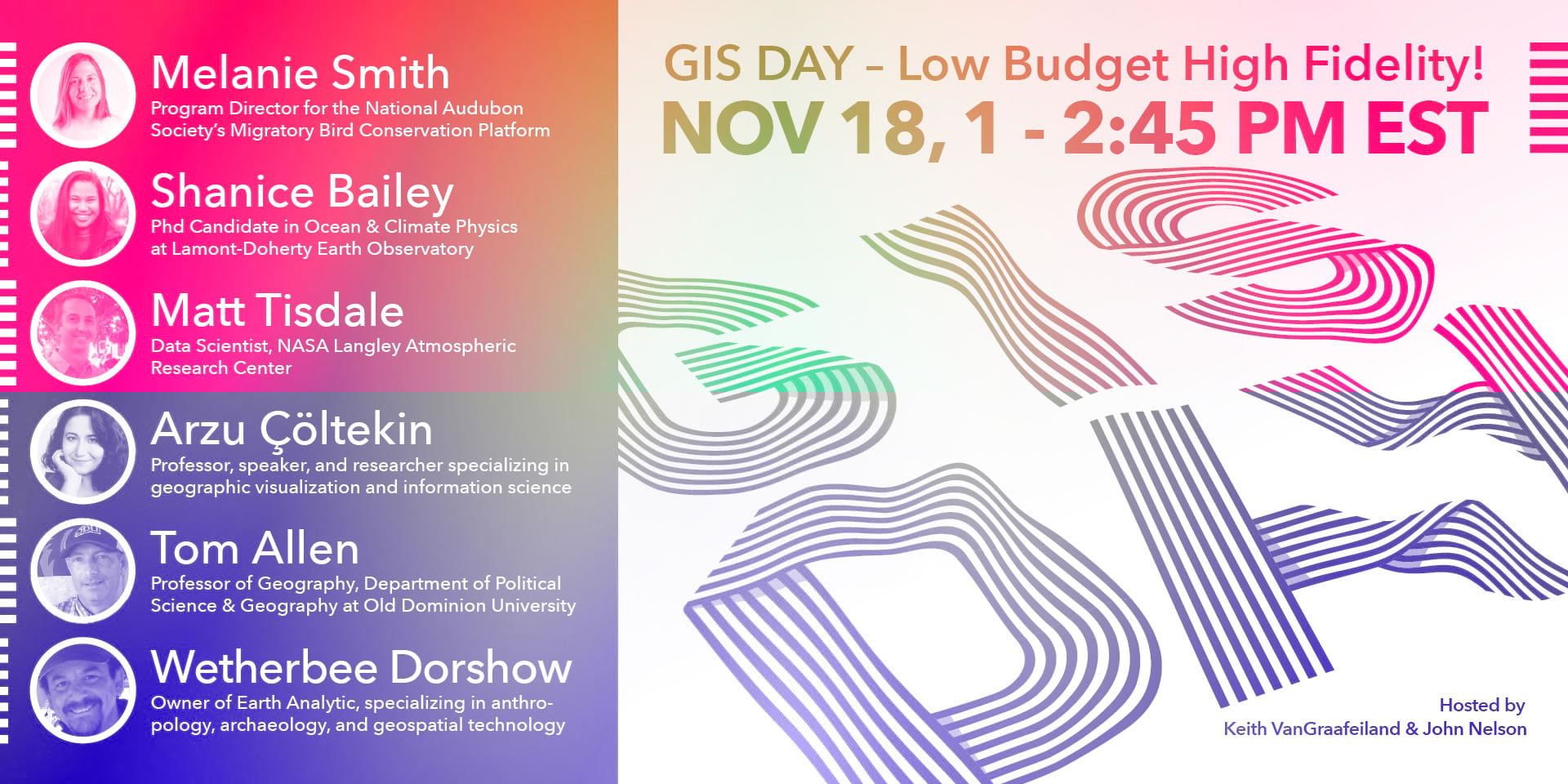 Our field is such a wonderful community of creative and clever folks working hard to provide structure and understanding. I’m constantly amazed at how generous folks are with their time and willing they are to share their resources and workflows. It’s a day to celebrate the wonder and knowable mystery of spatial thinking and geographic action. Keith VanGraafeiland (Keith is an oceanographer, and his surname is Dutch for “of the grave island.” Wow, do not mess with that guy) and I will be chatting with some intensely interesting geo-folks about the ways that they map the world, why they do it, and how you can too. Because we think it will be fun!