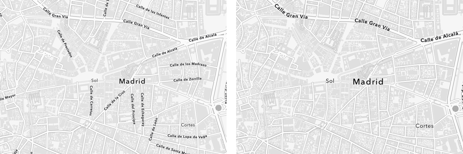 To accommodate the larger size, I introduced the labels at least one scale later than on the current map, and often two or more. This means that at any specific scale you will see fewer labels. Here are some before/after comparisons. The current map is on the left, and the ‘large label’ version on the right:
