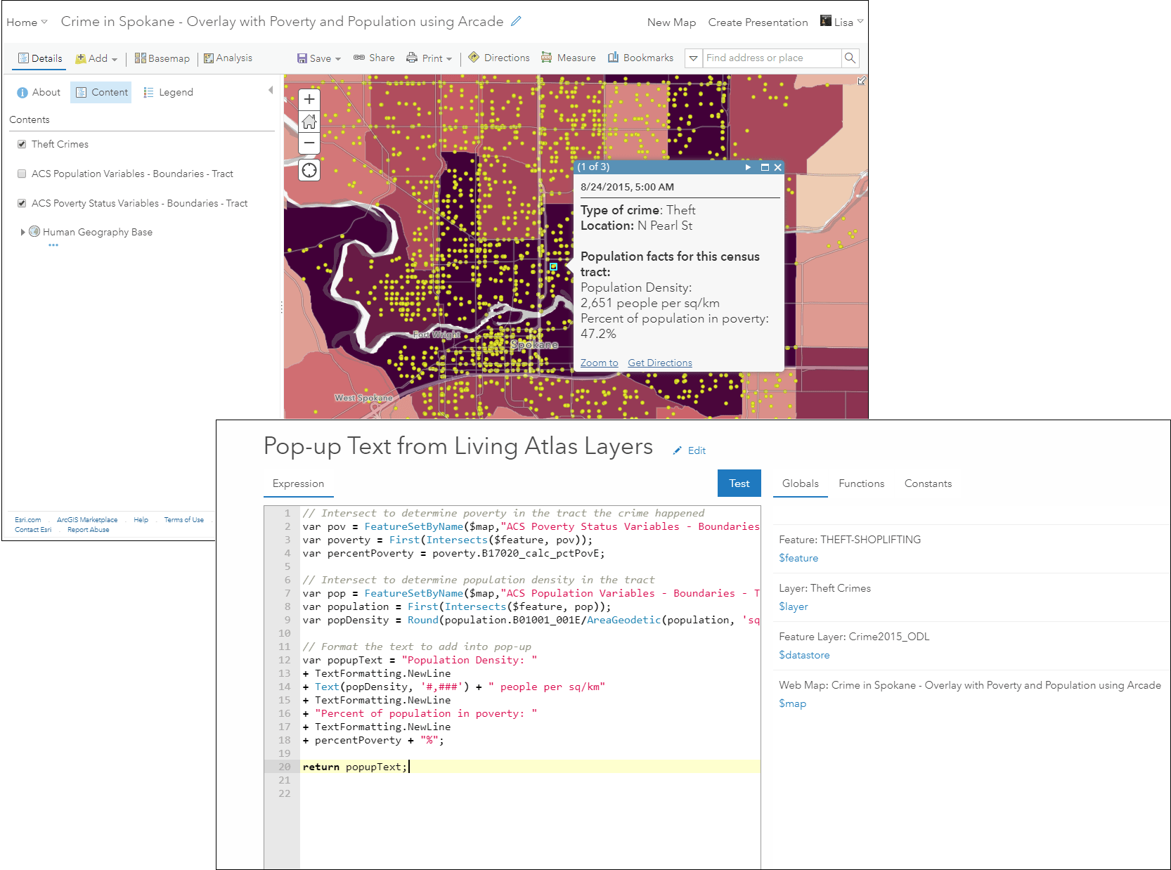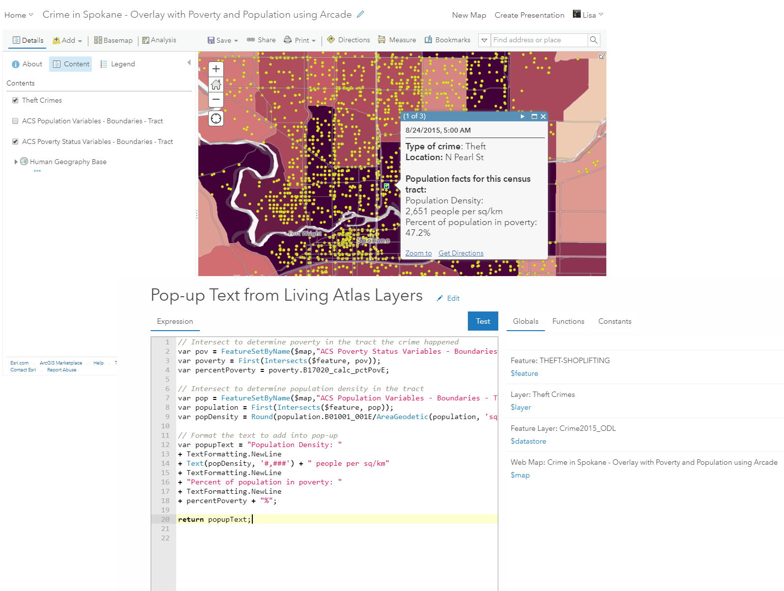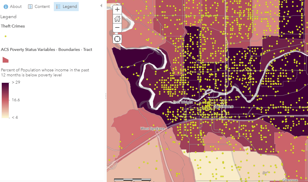 This is the easiest way to use the layers. Because each layer has been pre-configured with symbology and a pop-up, you can quickly plug-and-play the data directly into your maps. For example, I could add the ACS Poverty Status Variables– Boundaries layer into my map to immediately visualize where poverty is better/worse within my area. I can overlay this with my own data, such as crime locations, to provide additional context to any map.