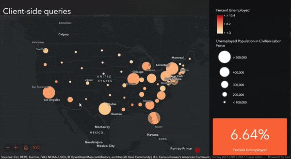 Because these ACS layers are hosted feature layers, they are easy to work with in JavaScript applications and scale nicely when your app is used more and more. Query, customize, and perform client-side analytics to enhance any map. This example was shown at the 2019 Developer’s Summit Plenary, and uses client-side queries to provide on-the-fly facts about unemployment within the United States as you zoom into the map.