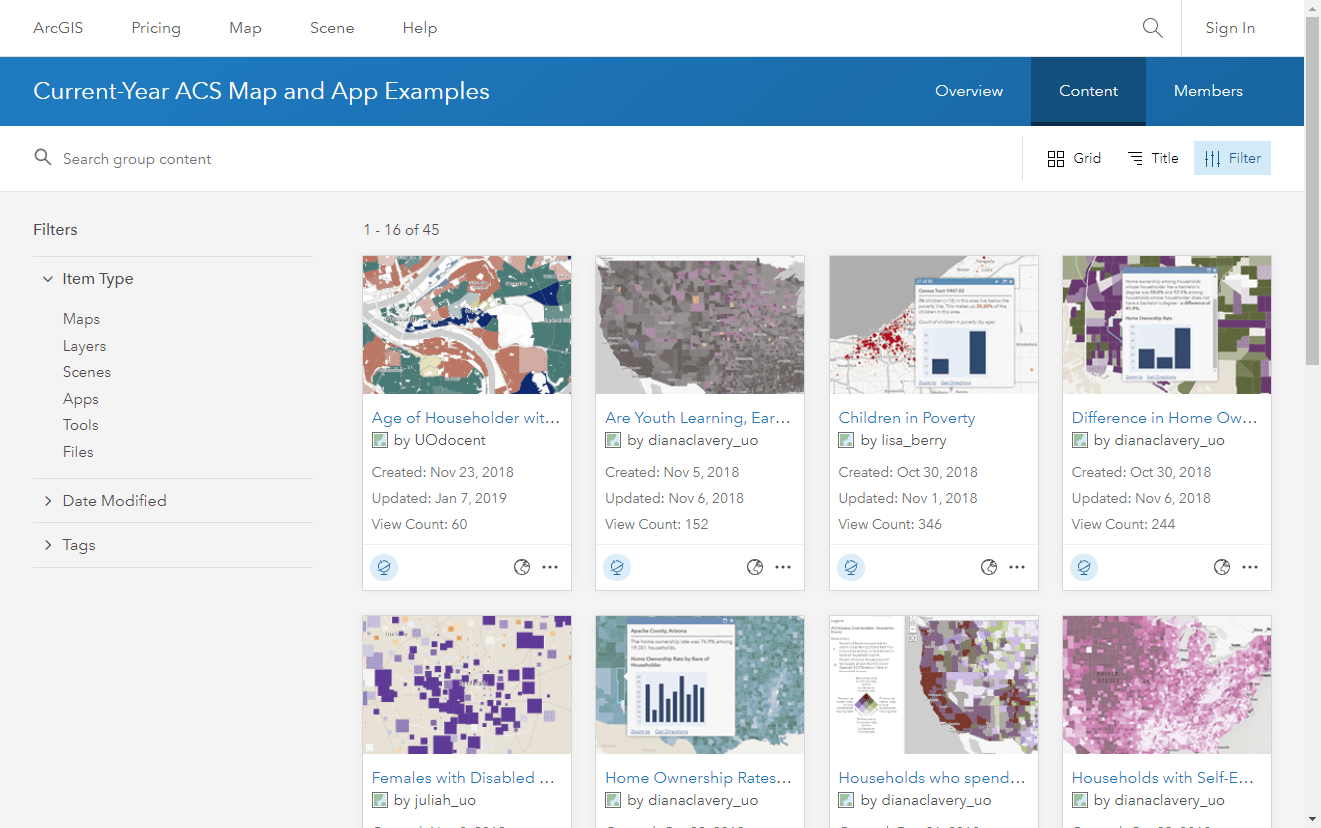 - Using the same “current year acs” search phrase mentioned earlier, search the Living Atlas website and filter to show only “maps”. Click here for this specific search.