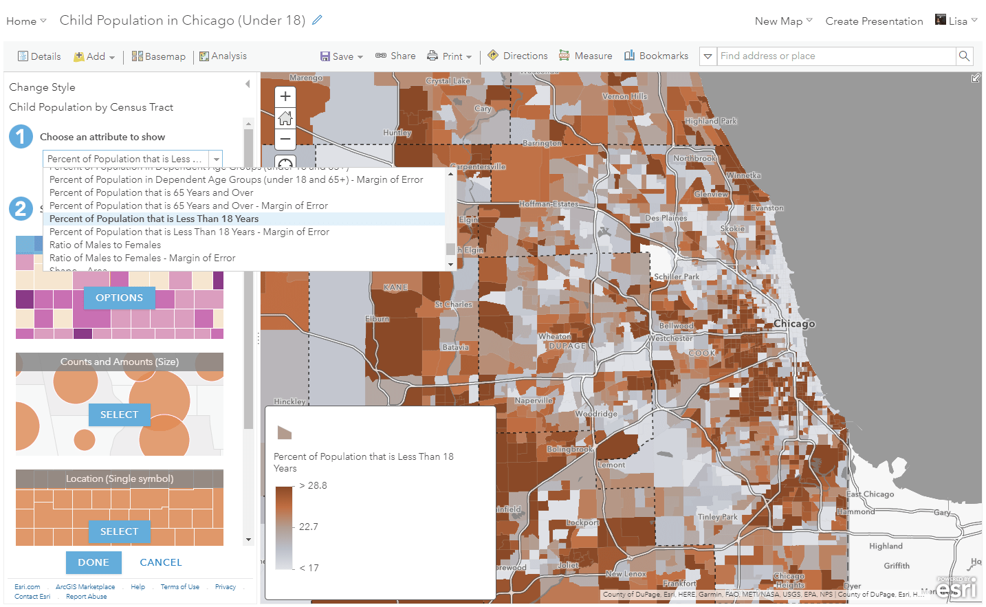 Each layer contains a wealth of attributes from ACS tables, so each layer can be customized beyond the default settings to show any of those attributes. To explore the attributes within the data, you can search through them within the table, the symbology selector, or on the item details page for the item. In just minutes, you can have a fully custom map for your area. For example, I could zoom to my area, add the “ACS Population Variables – Boundaries” layer, and choose to map the “Percent of Population that is Less than 18 Years” attribute to find the youth population in my area. For a step-by-step tutorial about making your own localized map with these layers, you can visit this blog.