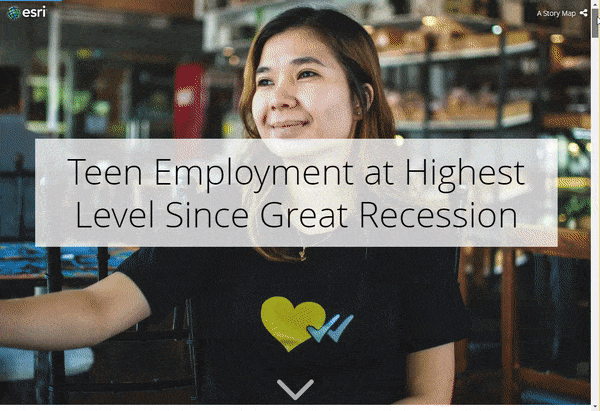 You can easily use web maps calling to these layers within your dashboards, applications, Story Maps, and more. The example below uses the “ACS Youth School and Work Activity Variables – Centroids” layer within custom-made web maps to tell a story about teen employment within the United States.