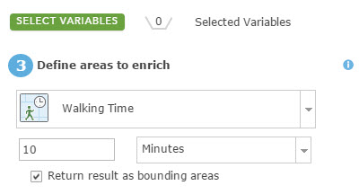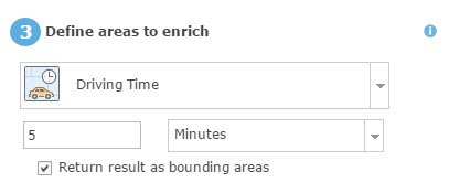 For this scenario, Drive time >> 5 minutes >> Choose “Return result as bounding area”