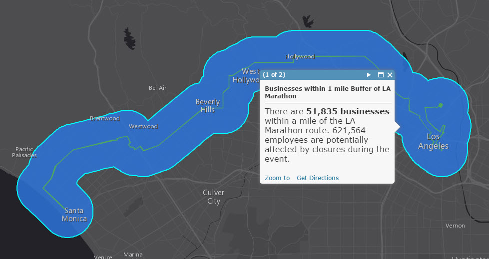 Scenario: You have linear data for the LA Marathon route. You need to know how many retail businesses are within a mile of that route so that you can assess the impact of this event.