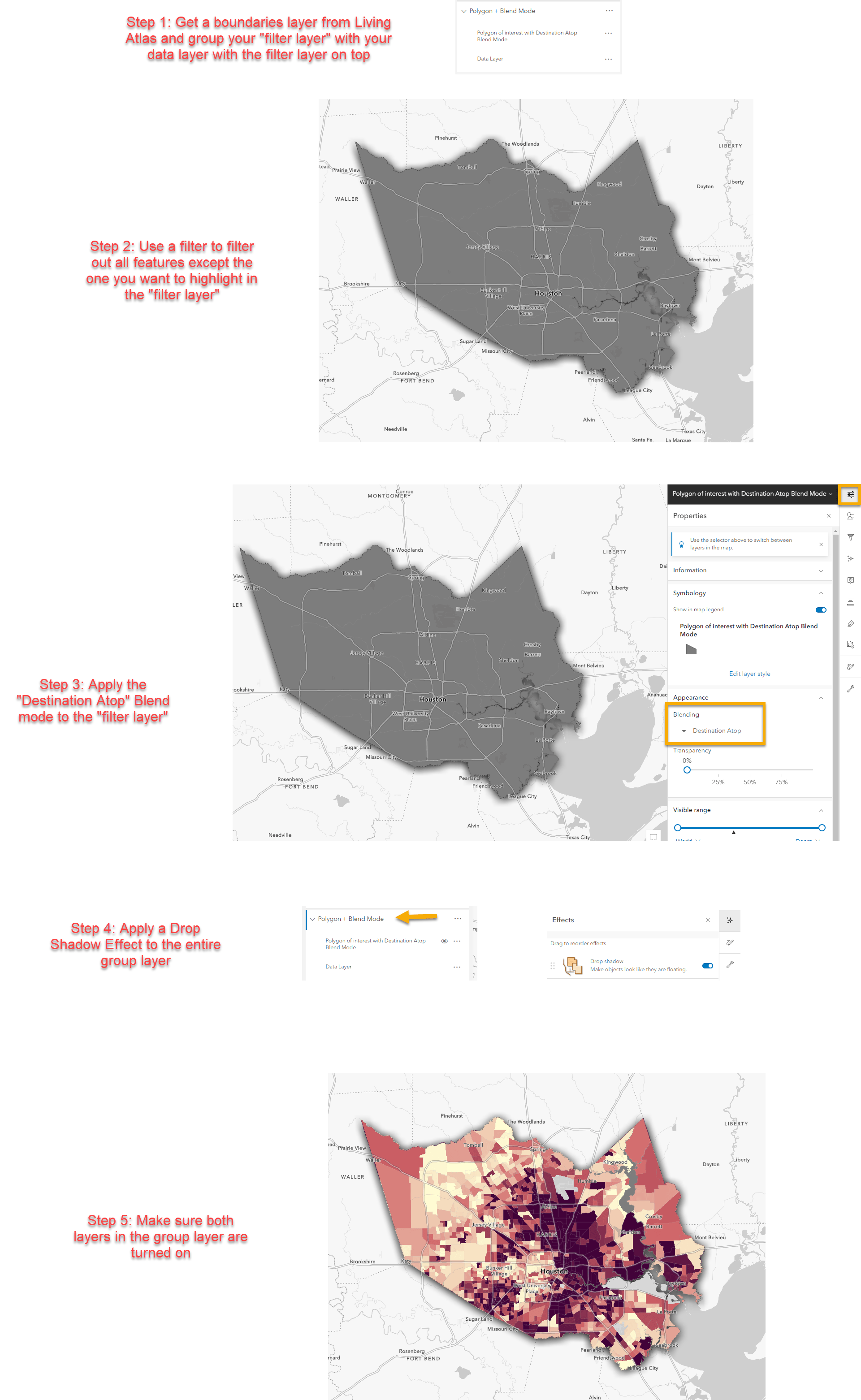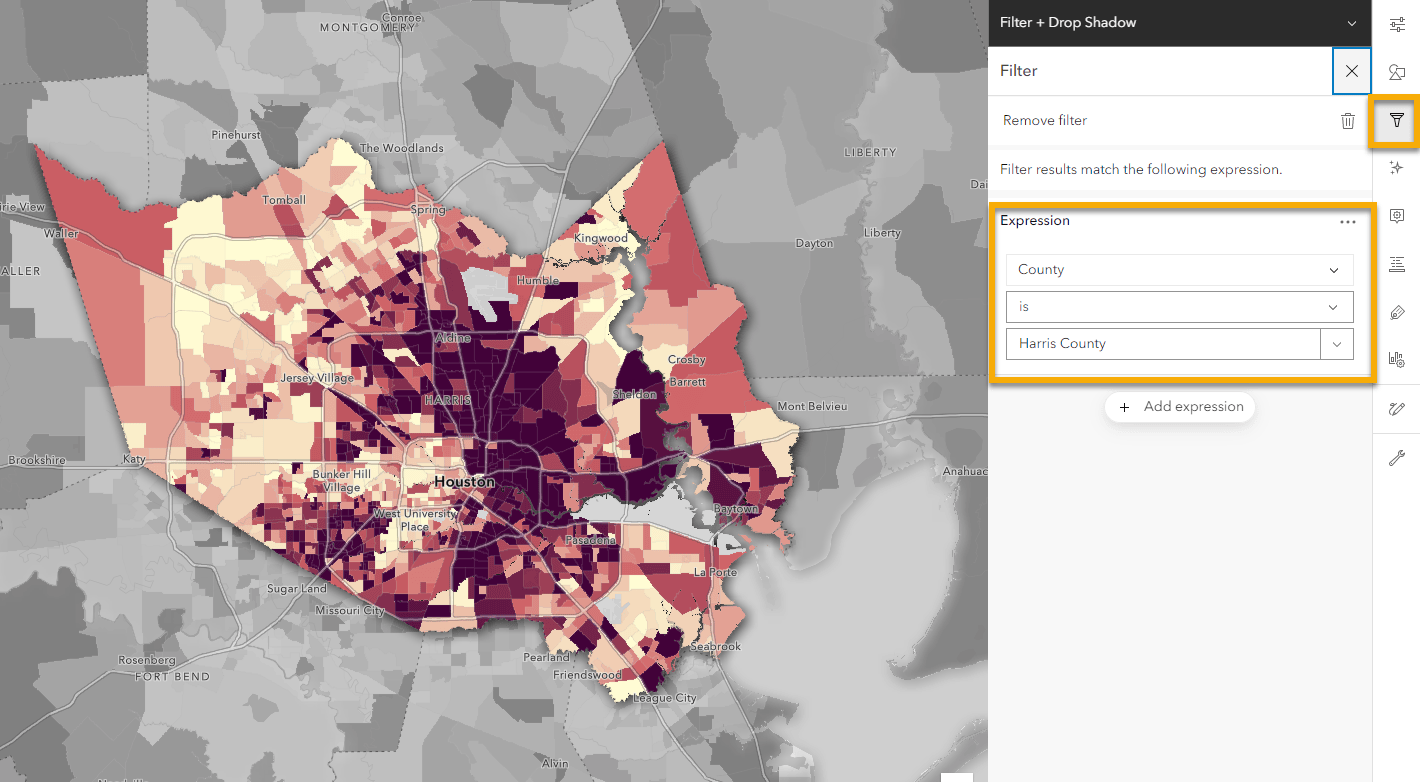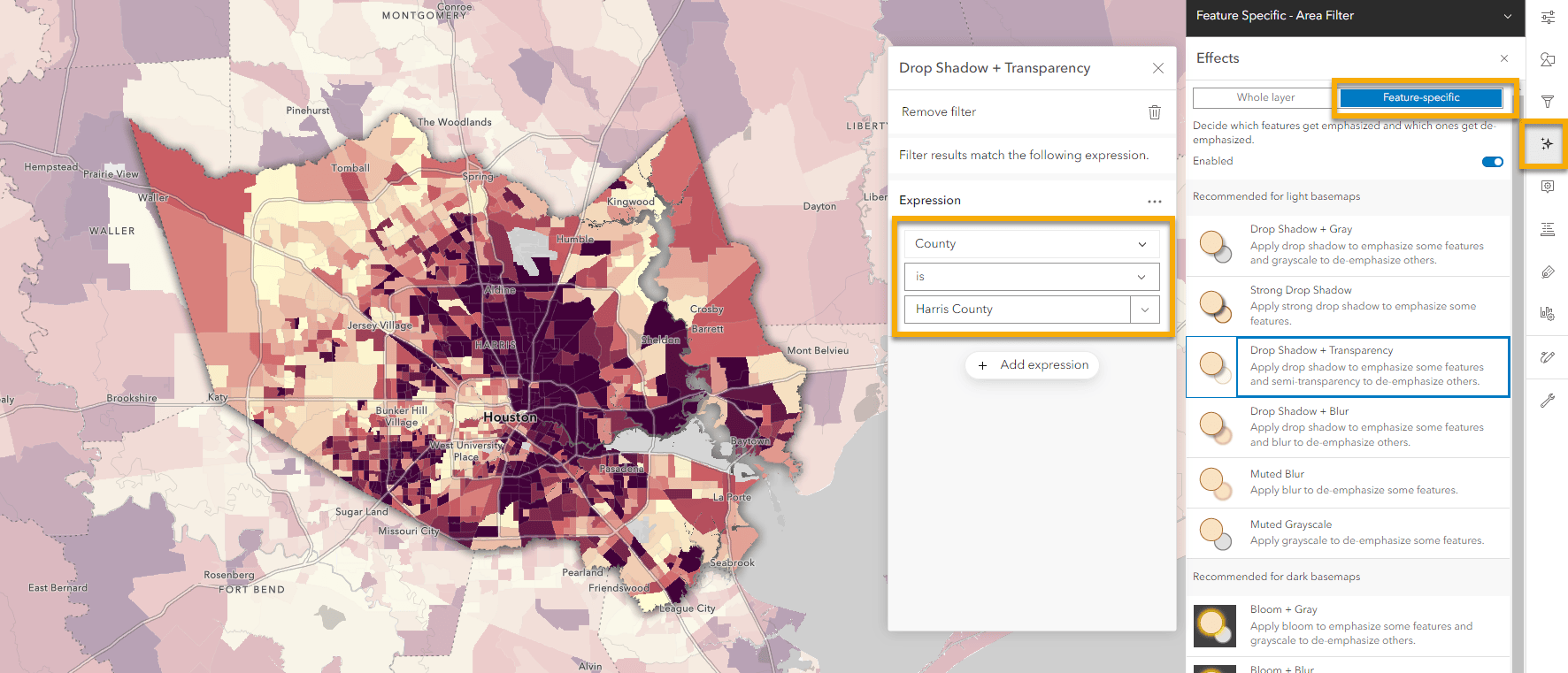 - If you don’t have a field to filter with – Bring in a Living Atlas layer from the Boundaries category, and filter that layer to the area you want to show. In this case, it is filtered to Harris County like the example above + Blend Mode