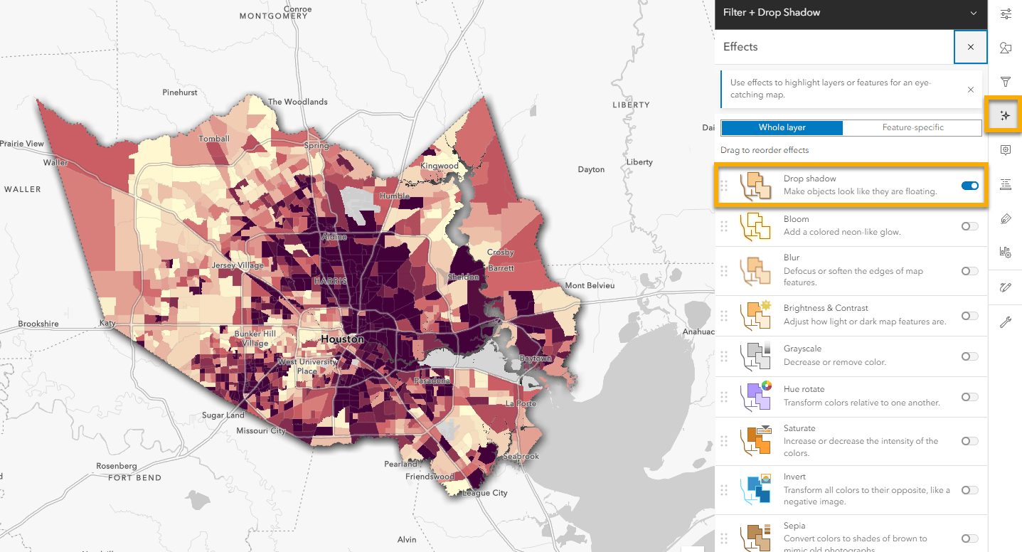 - If you have a field to use from your data – Apply the Filter for the features you want to emphasize + add a Drop shadow from the Effects Pane. In this case, there’s no need to group any layers.
