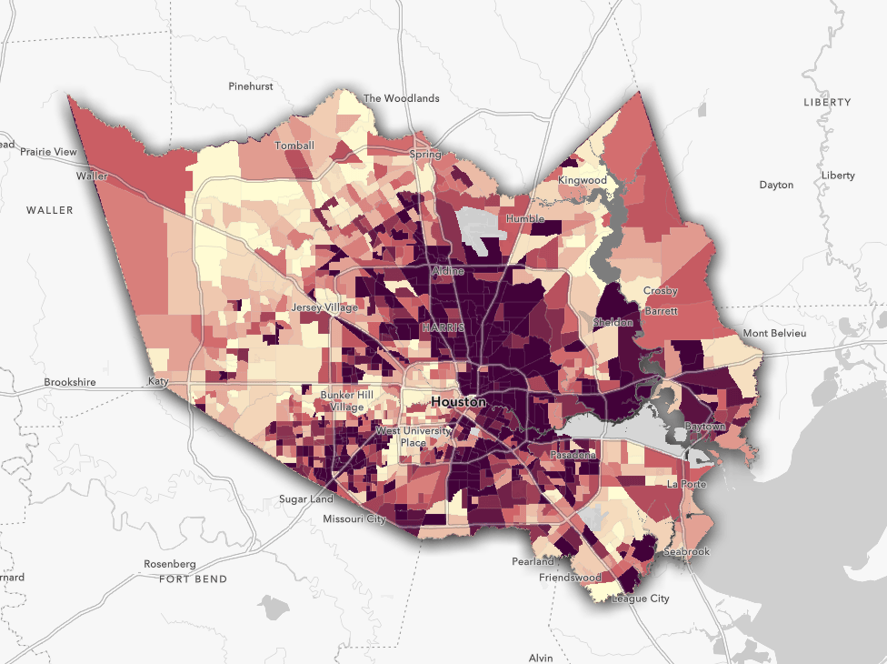 Now keep in mind that this map on its own is informative and interesting, but in many cases, we want to highlight the pattern within our county. The examples below talk through how to emphasize Harris County, TX, but similar techniques can be used with your own data for different geography levels.