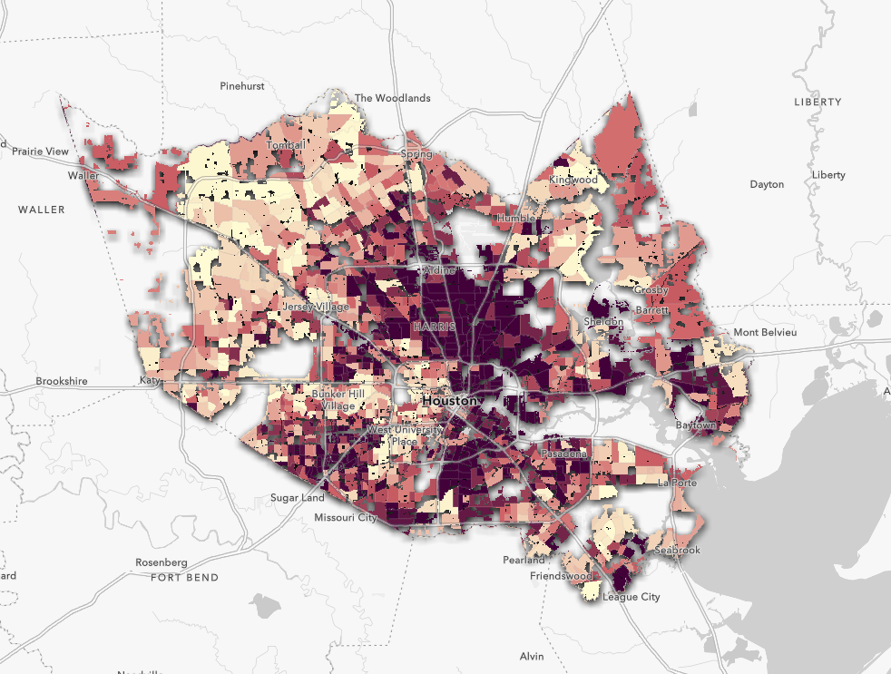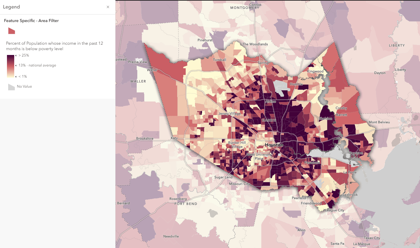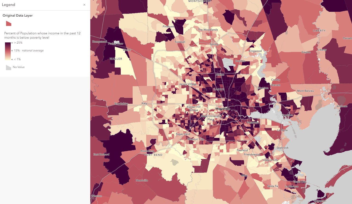 Feel free to follow along or try out the techniques on this web map as you read this blog, or just use this as a reference for when you want to accomplish a similar approach. By default the map shows us the percent of poverty within the Houston, TX area using the Living Atlas Census ACS layer: ACS Poverty Status Variables – Boundaries.