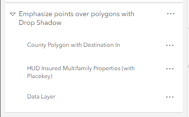 Create a group layer with your area of interest polygon (don’t forget, you can find these in Living Atlas), the point layer you want to use (in our example, we are using a HUD layer about multifamily properties from Living Atlas), and your thematic data layer at the bottom.
