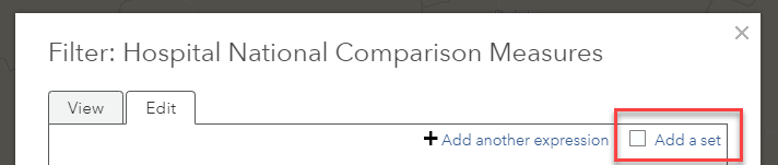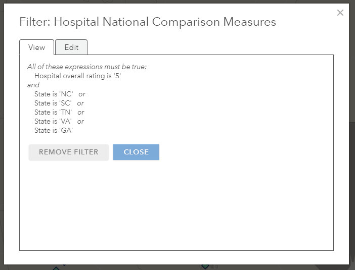 Because these hospitals are in one and only one state, I’m selecting “any of the following expressions in this set are true” rather than “all” like we selected before. When you have added all your desired sets of expressions, click the View tab at the top to see your final filter:
