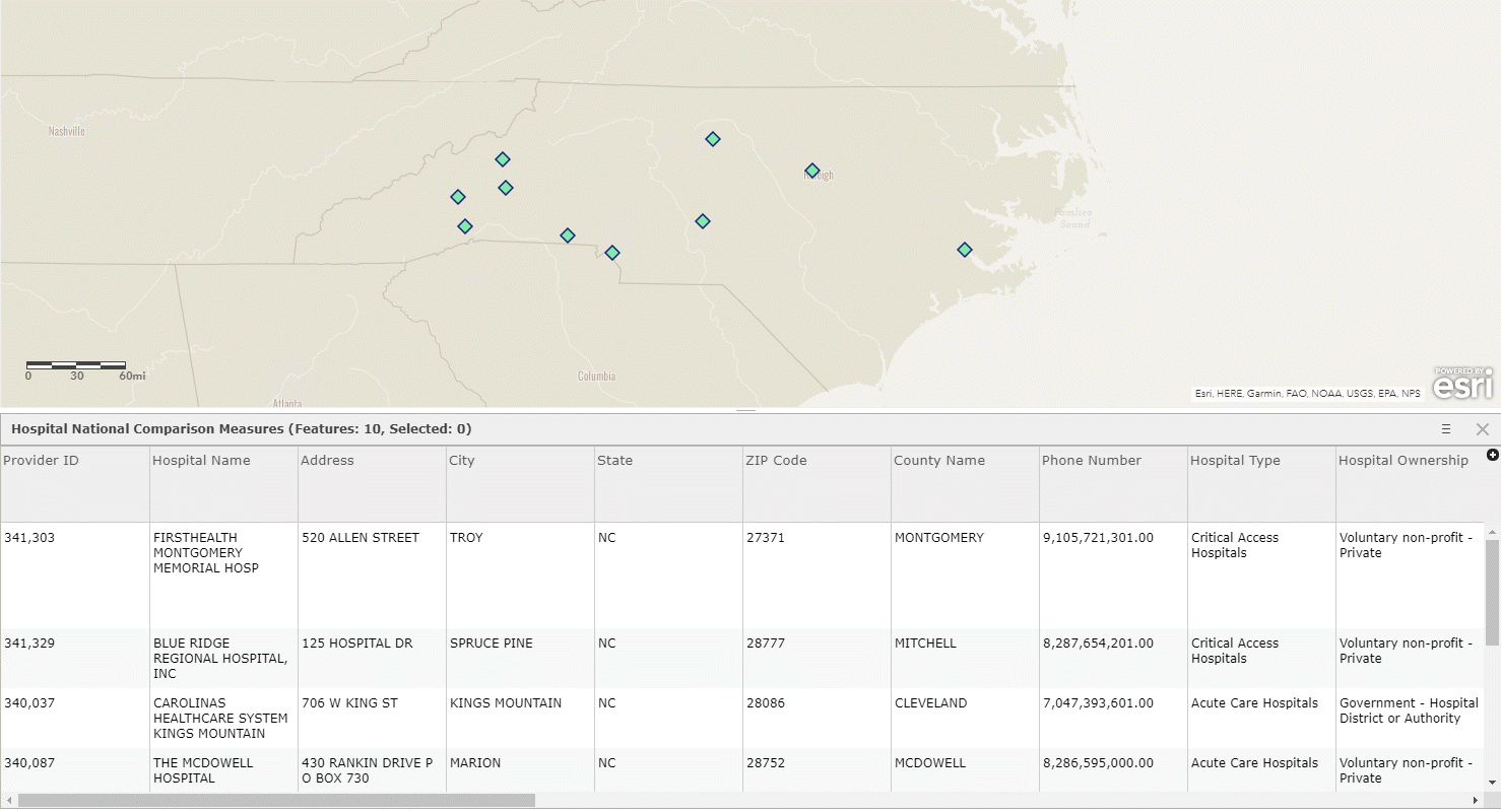 Apply the filter, and you will see that only the hospitals within North Carolina with a valid quality ranking are the ones that appear on the map and in the attribute table. Because I selected “…all of the following expressions” I see features that satisfy both criteria.