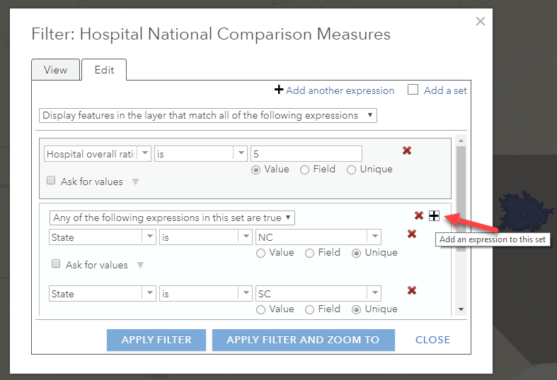 Grouping multiple filter expressions into sets allows for a bit more complexity in defining your subset. Say instead of showing the 5-star hospitals in the state of North Carolina only, I want to show the 5-star hospitals in neighboring states as well. It’s possible that these out-of-state hospitals are serving people in North Carolina how live close to the state lines.