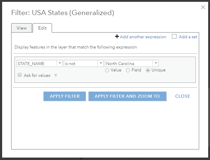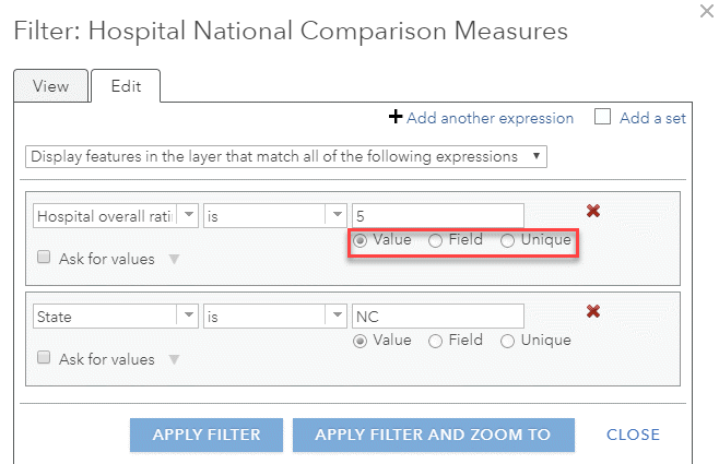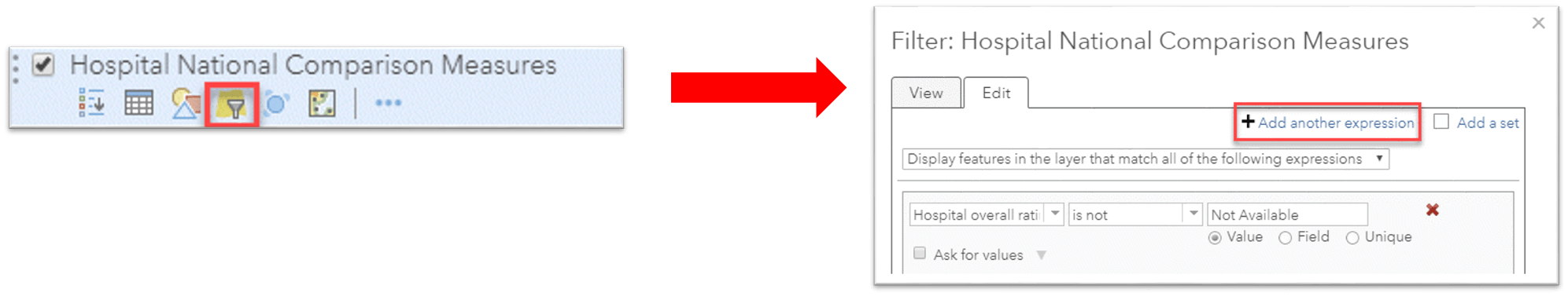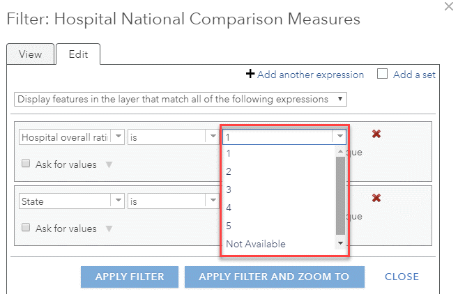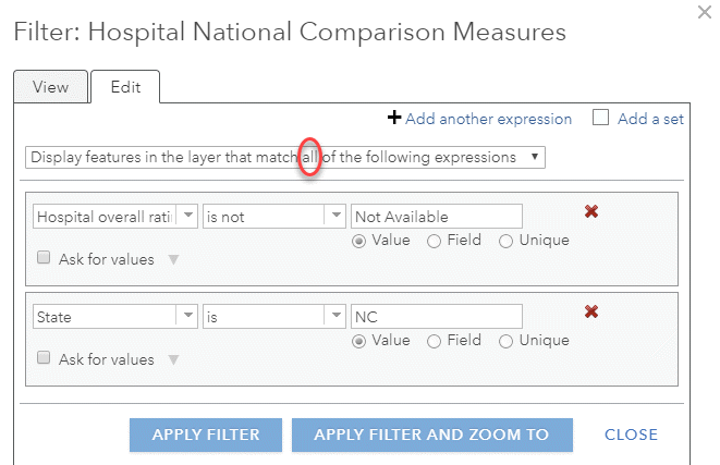 According to this layer’s Item Details Page, there is a filter applied such that only hospitals with a valid quality rating (1 through 5 stars) actually display: Hospital overall rating is not ‘Not Available.’ That works for now, but I need to add a second filter to work with only North Carolina hospitals: State is ‘NC.’ I’ll do that by opening the filter and clicking “Add Another Expression.”