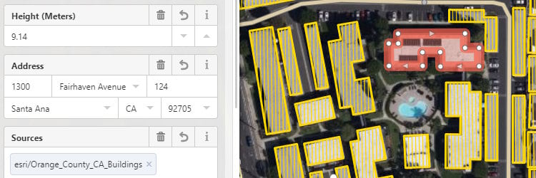 Using RapiD, you can select one of the ArcGIS Datasets (e.g. Orange County, CA Buildings, such as above), center map on that dataset, and zoom in to an area where you would like to make edits. RapiD will only display the features that do not conflict with existing features in OSM so that you don’t accidentally duplicate or replace those features.