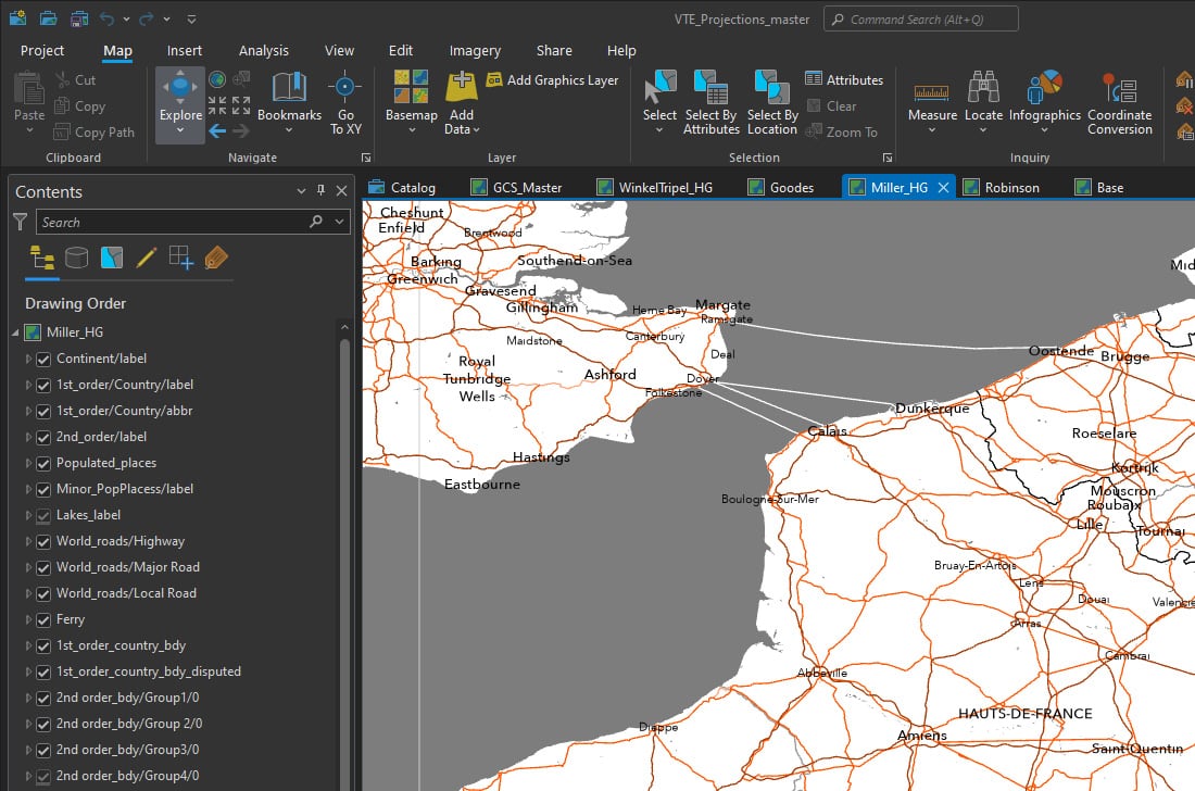 I used ArcGIS Data and Maps. It’s available to most of us, and it was a chance to prove that you don’t have to access anything too sophisticated to get a result. It needed a bit of preparation though, and this is where the bulk of my time went. I decided to create a style based roughly on the Human Geography basemap. So, working in ArcGIS Pro I collected the features I thought were relevant, created polygon, line and point features where necessary, and did some clean-up.
