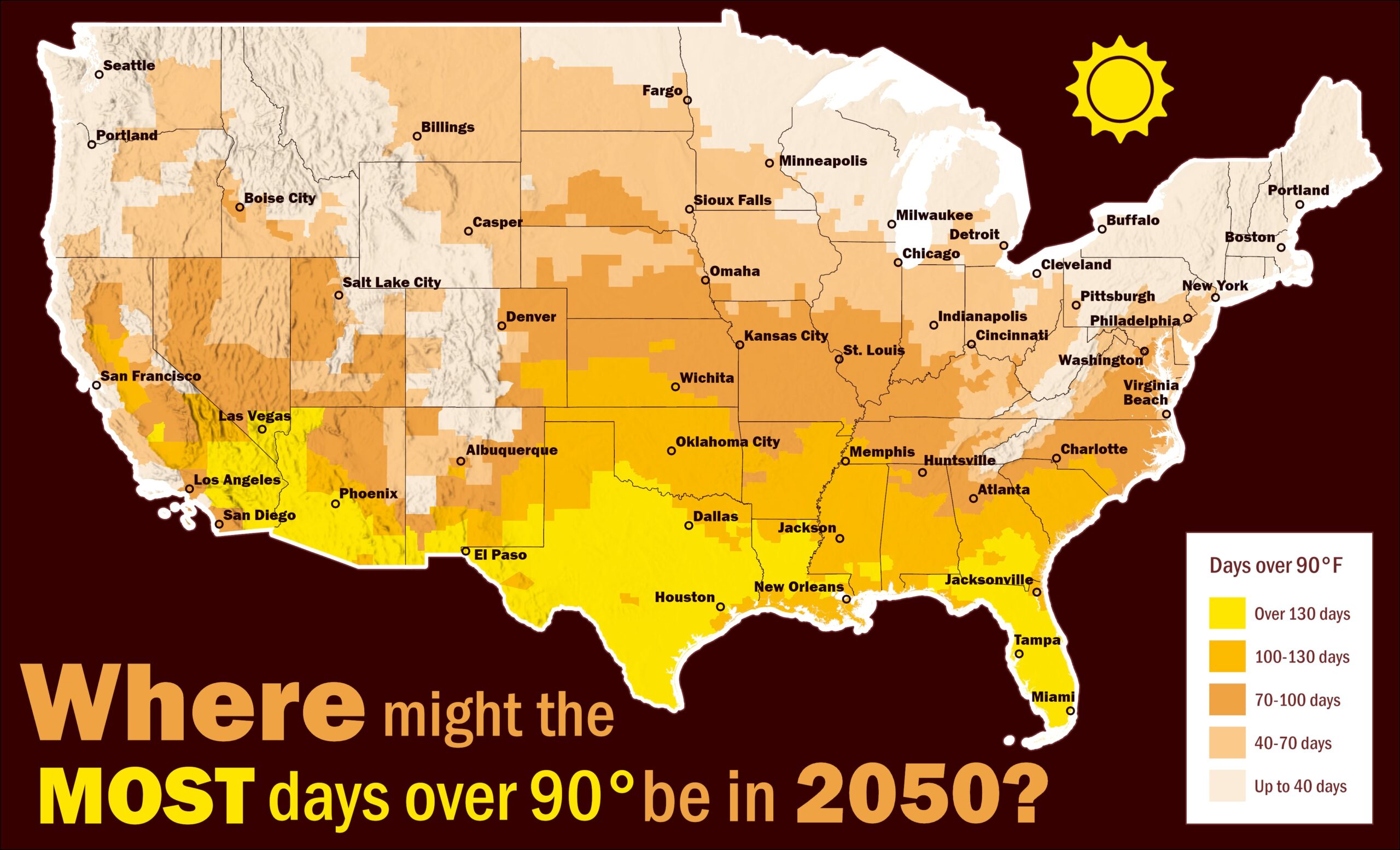This second way of thinking about heat risk focuses on areas that are already extremely hot and could have even more severe heat events in the future. One common metric for extreme heat is days over 90°F, which shows areas of the U.S. with the worst lethal heat. Using the LOCA data, we can see areas of the U.S. that could experience the most days over 90°F in 2050.