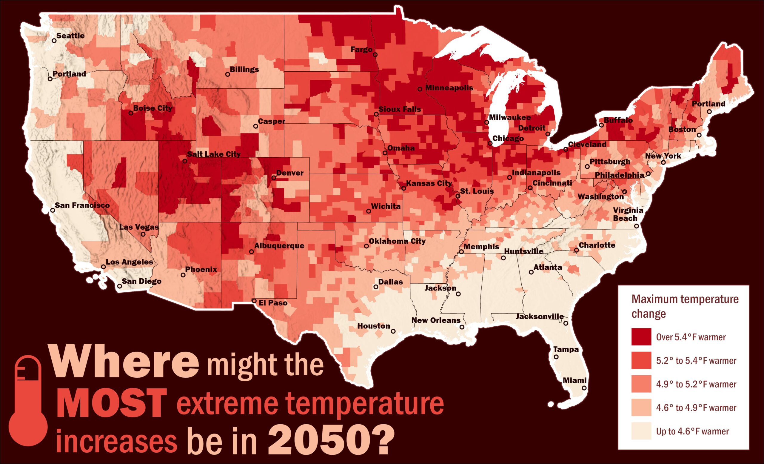 Clearly the middle of the country may face the biggest temperature jumps over the next several decades The flip side of this is, of course, that the Midwest and northern Great Plains are not the hottest places to begin with. So even if these regions warm the most they may not have the highest heat risk. Minneapolis may warm on average of 5.6°F, but that is from a relatively cool baseline. This brings us the second way to think about heat.