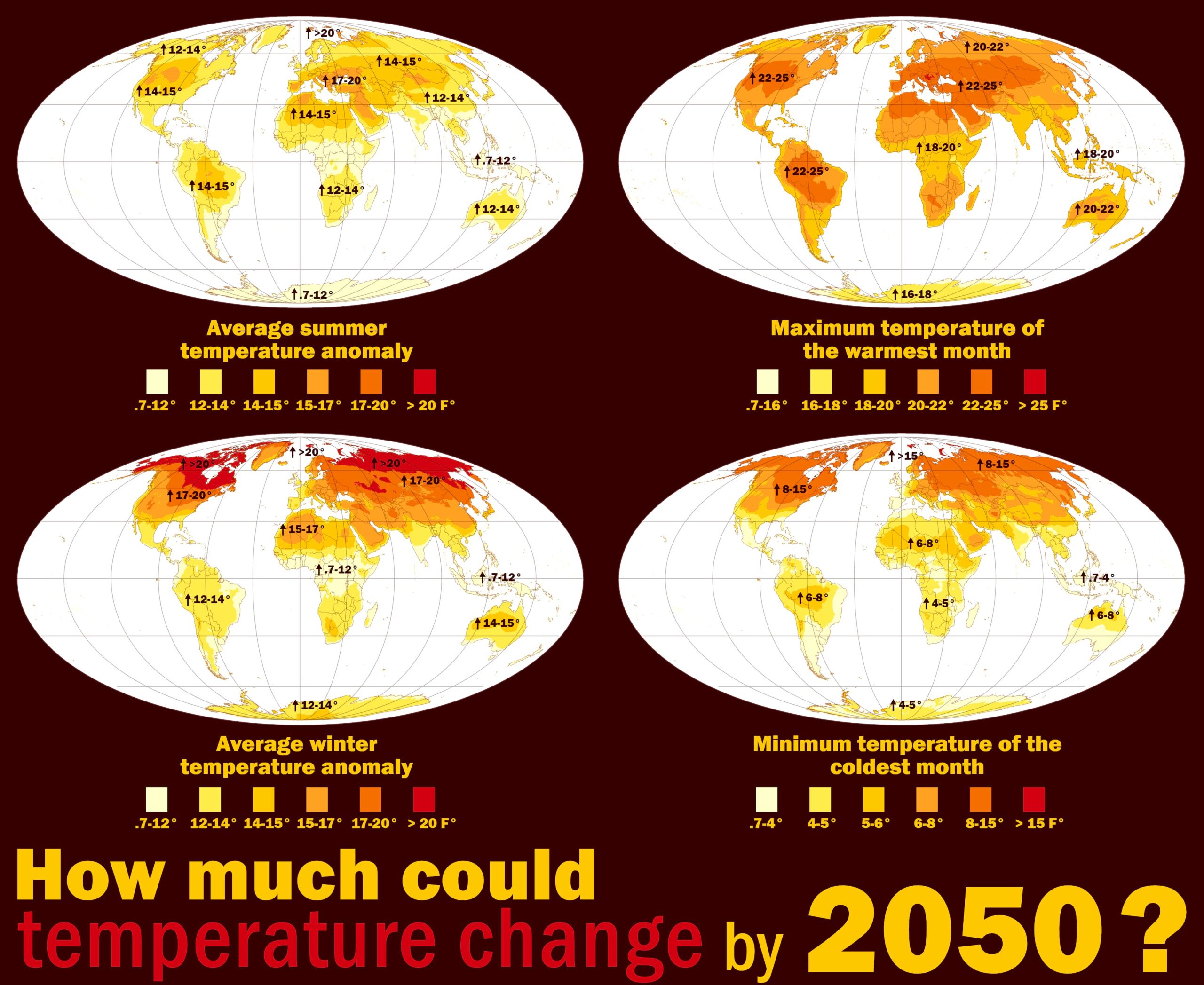 See the map above? You can ignore it too. Maps of mean annual temperature change are really talking about averages of averages. We’re taking daily mean temperatures and dulling them even more by averaging across a year, and then averaging those years over decades. These averages are helpful for understanding basic temperature increases, but they really blunt the impact of dangerous, extreme heat. Breaking temperature anomalies into seasons can show some of these extremes. Even better, variables like Maximum Temperature of the Warmest Month shows how much hotter the hottest days may get.