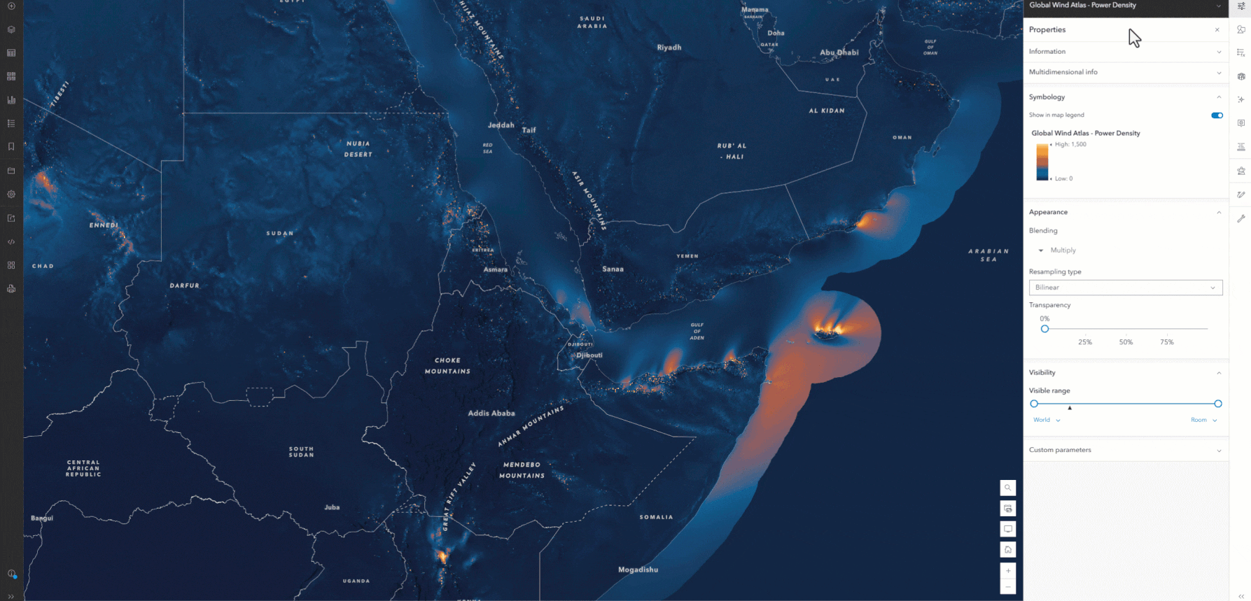 However, an added challenge is these layers are multidimensional image services, which means the entire range of the data needs to be accounted for, not just what’s presented in one selected dimension. Here’s an example showing Wind Power Density around the Horn of Africa. You can see when you change the height, it first starts with dark blue all over the map but then the orange and yellow values increase and the map looks completely different.
