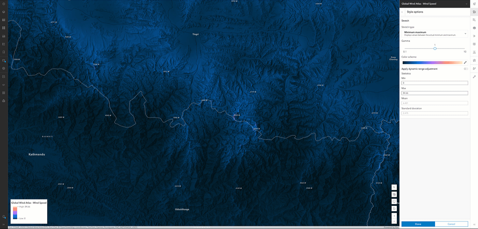 One last note, the raw multidimensional image services come symbolized with the minimum and maximum value by default. Using Wind Speed as an example, that meant the range was 0-84.66 meters per second. Having it set that high meant we weren’t able to see the full spectrum of information because the outliers were skewing the color scheme. You can change this in ArcGIS Pro and Online so we modified the maximum value to 12 meters per second which is considered the speed at which most turbines can produce their maximum power. Here along the border of Nepal and Tibet watch how to modify that in ArcGIS Online.