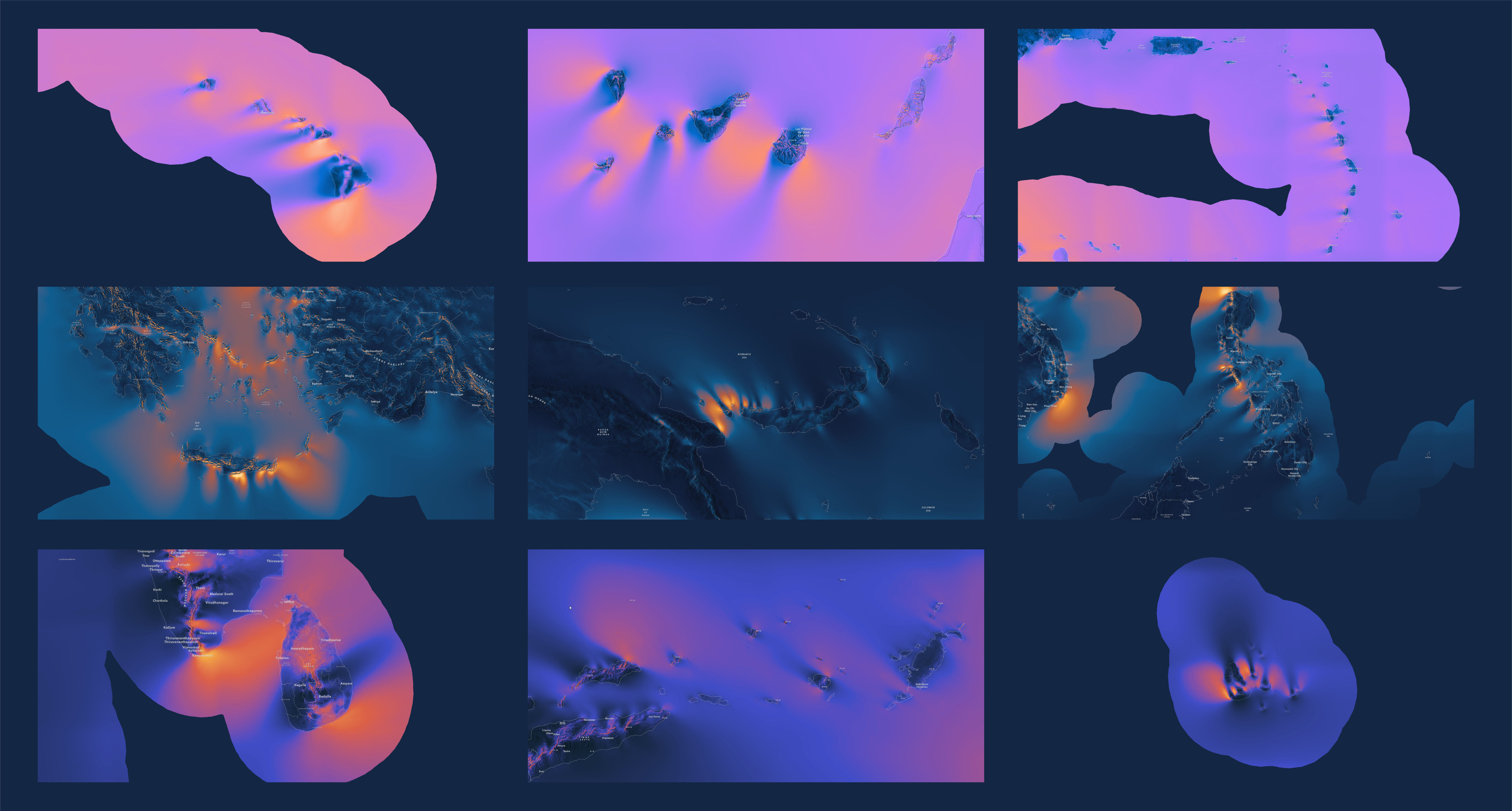 The last part of the color schemes are the dark blue values. Dark maps do a good job of being the backdrop for data that has a diverse geography and a massive range. Unlike a light background which can dominate by being bright, a dark background disappears and allows even the most minimum values of wind dynamics to be seen.