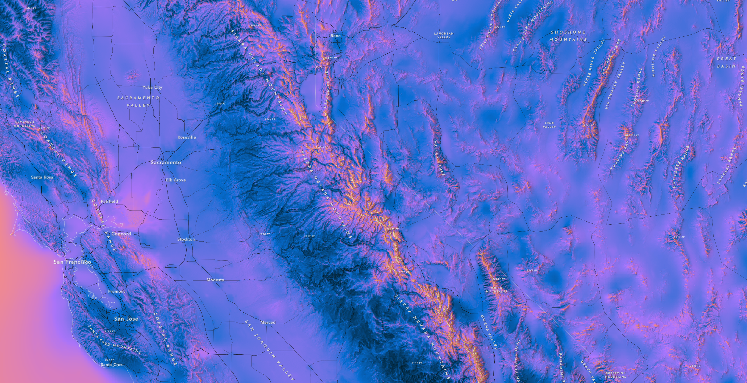 The Sierra Crest is the spine of California. It runs roughly north-to-south and demarcates the western and eastern slopes of the Sierra Nevada. This example shows Wind Speeds up to 100 meters. The highest granite peaks are easily discerned.