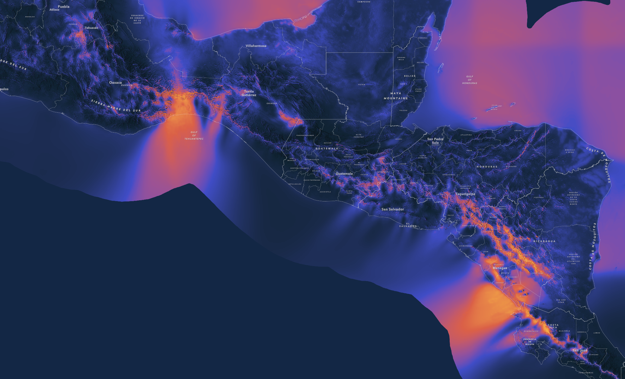 In Central America there are two distinct wind patterns you can see on this map of Wind Capacity Factor IEC 1. In Mexico the Tehuano Wind travels through the Chivela Pass across the Isthmus of Tehuantepec. In Nicaragua, the Papagayo Wind travels from the Caribbean Sea through the low elevation areas of Lake Nicaragua.