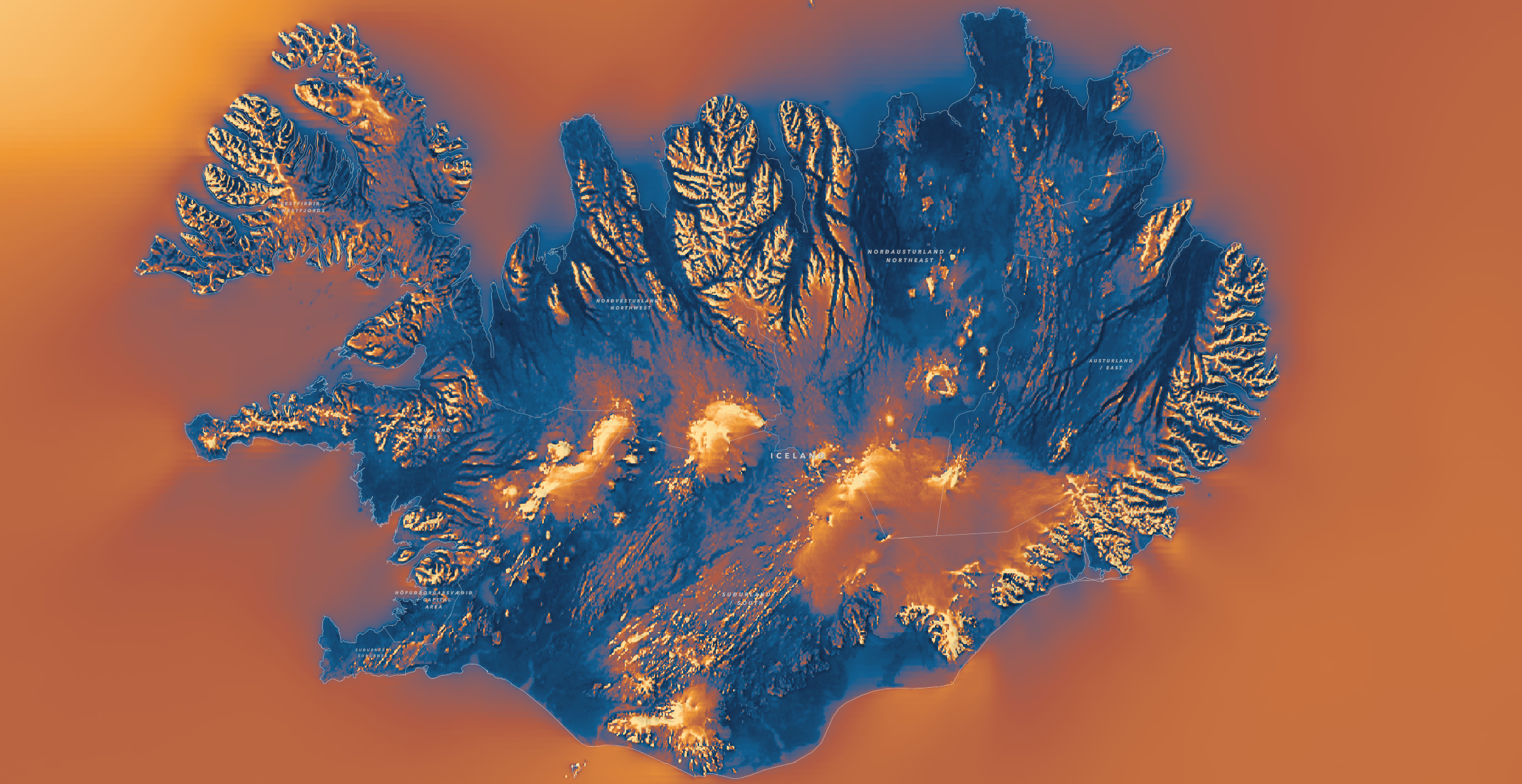In Iceland in the center and southern part of the country you can see katabatic winds coming off Snæfellsjökull, Langjökull, Hoffellsjökull, Vatnajokull, and Mýrdalsjökull glaciers with the Wind Power Density 10 meters layer.