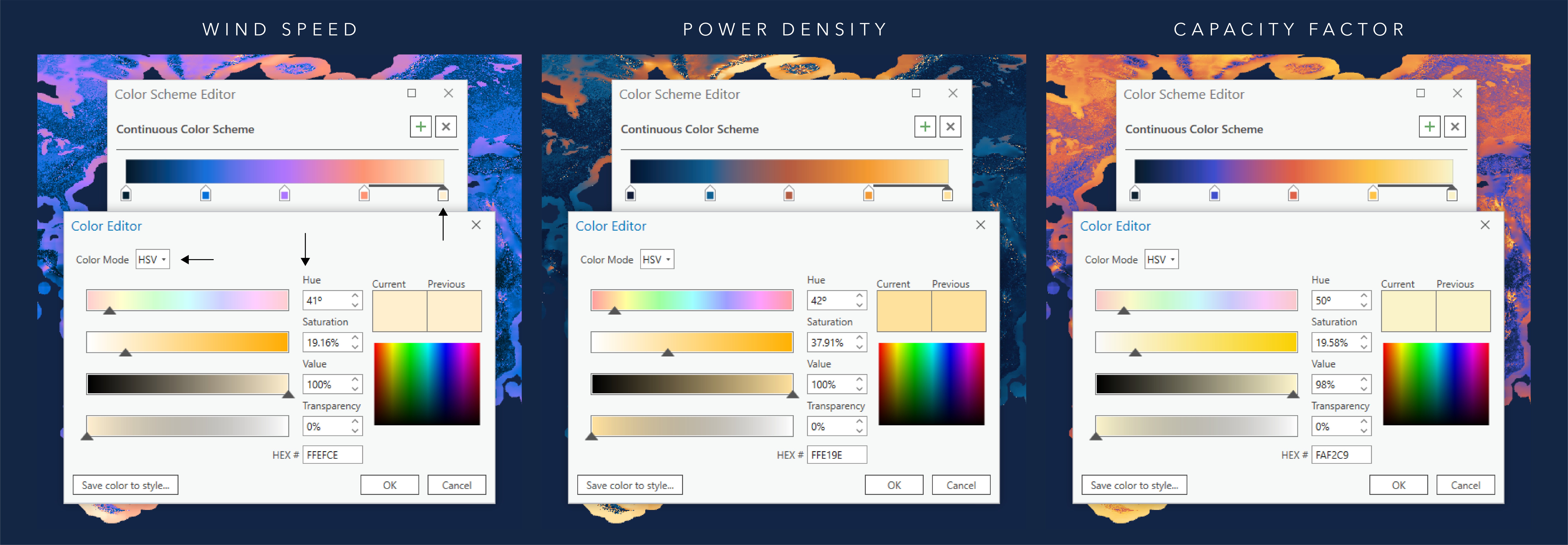 The schemes were developed in ArcGIS Pro using the HSV Color Mode. HSV is an additive color mode made up of hue (H), saturation (S), and value (V) or brightness. You can finesse colors with precision using HSV and this is the mode I develop colors in the most.