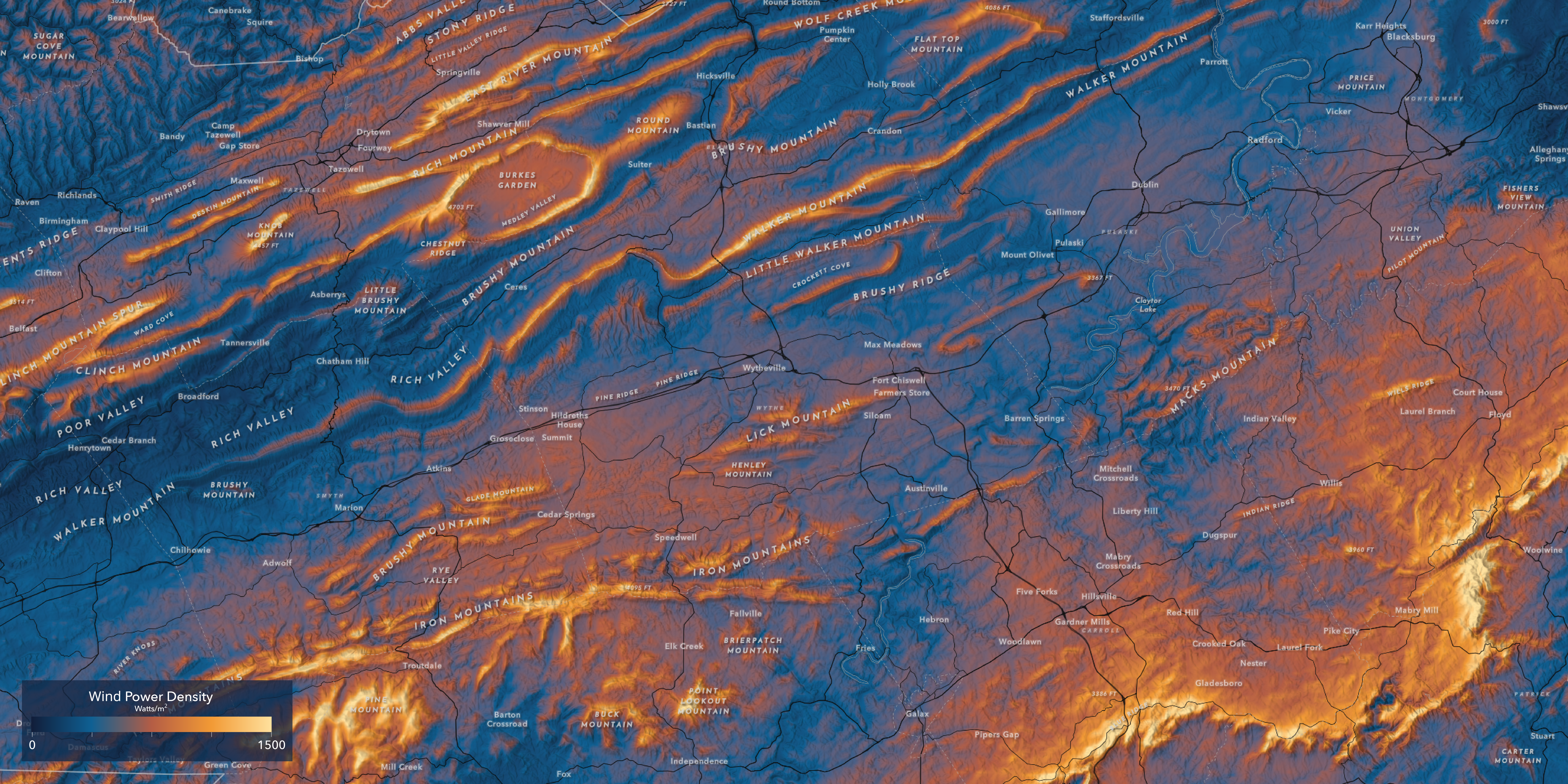 Wind Power Density 150 meters in part of the Appalachian Mountains in southwest Virginia, USA.