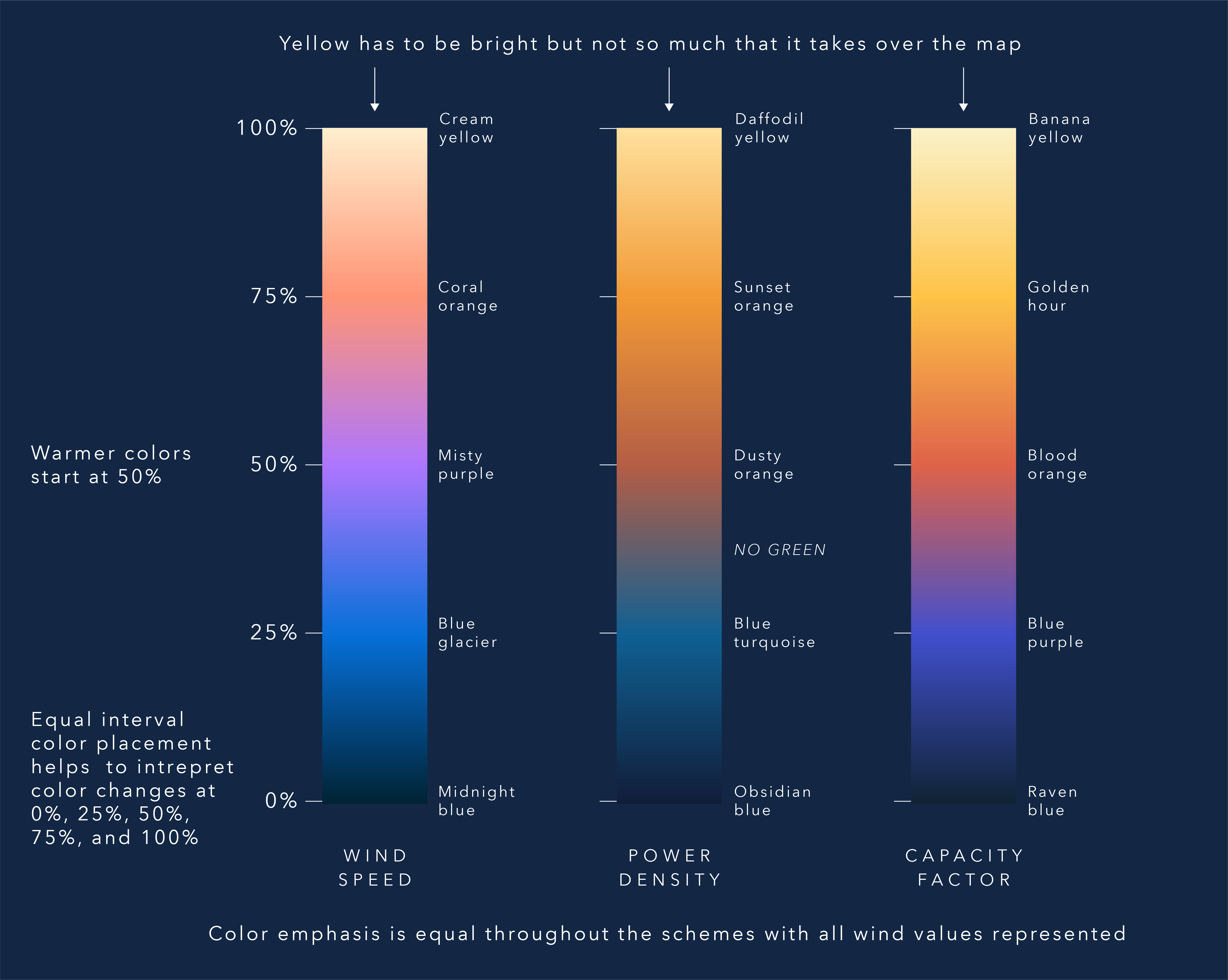 The wind layers are image services made from raster data, so we used an equal interval continuous color scheme to display minimum and maximum values. Equal intervals with definitive color stops allow viewers to understand things as a percentage of a whole, so there are color changes at 0, 25, 50, 75, and 100%. The goal was to look at the color scheme and quickly organize what the colors represent (for example, this color is twice as much as that one).