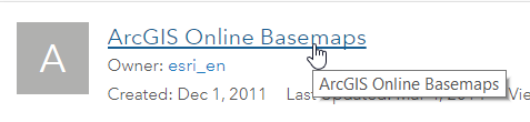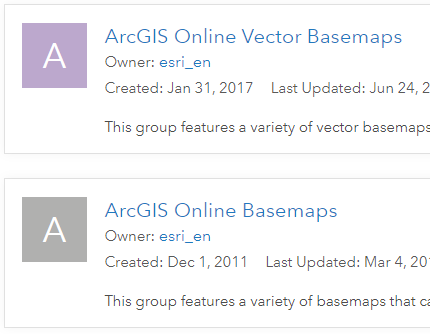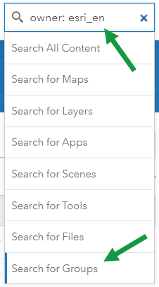Step 2. Locate the Esri raster basemap group and the Esri vector basemap group. For English users, the groups are owned by esri_en and can be found using group search for owner: esri_en. For French, the owner is esri_fr, and so forth.