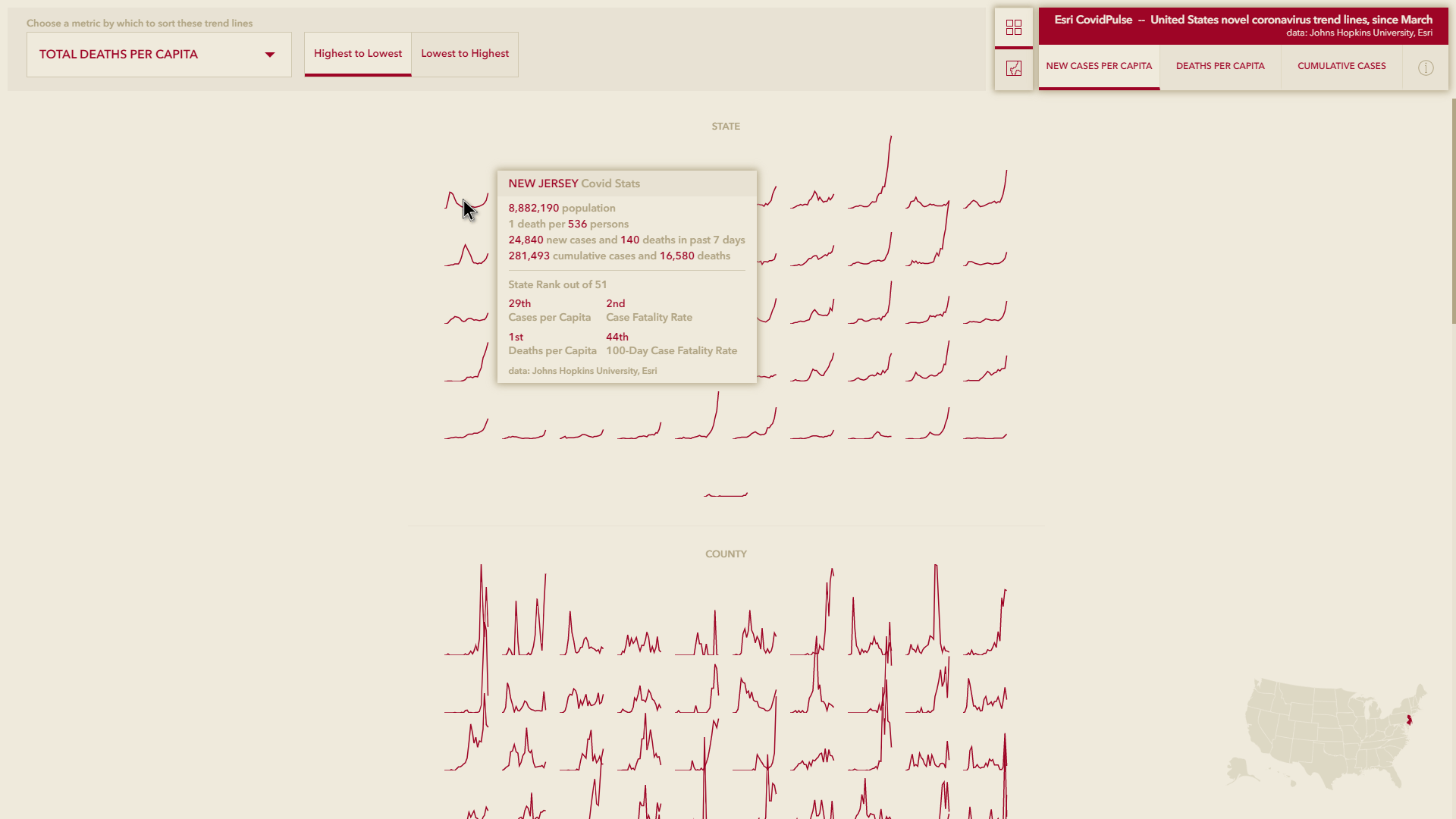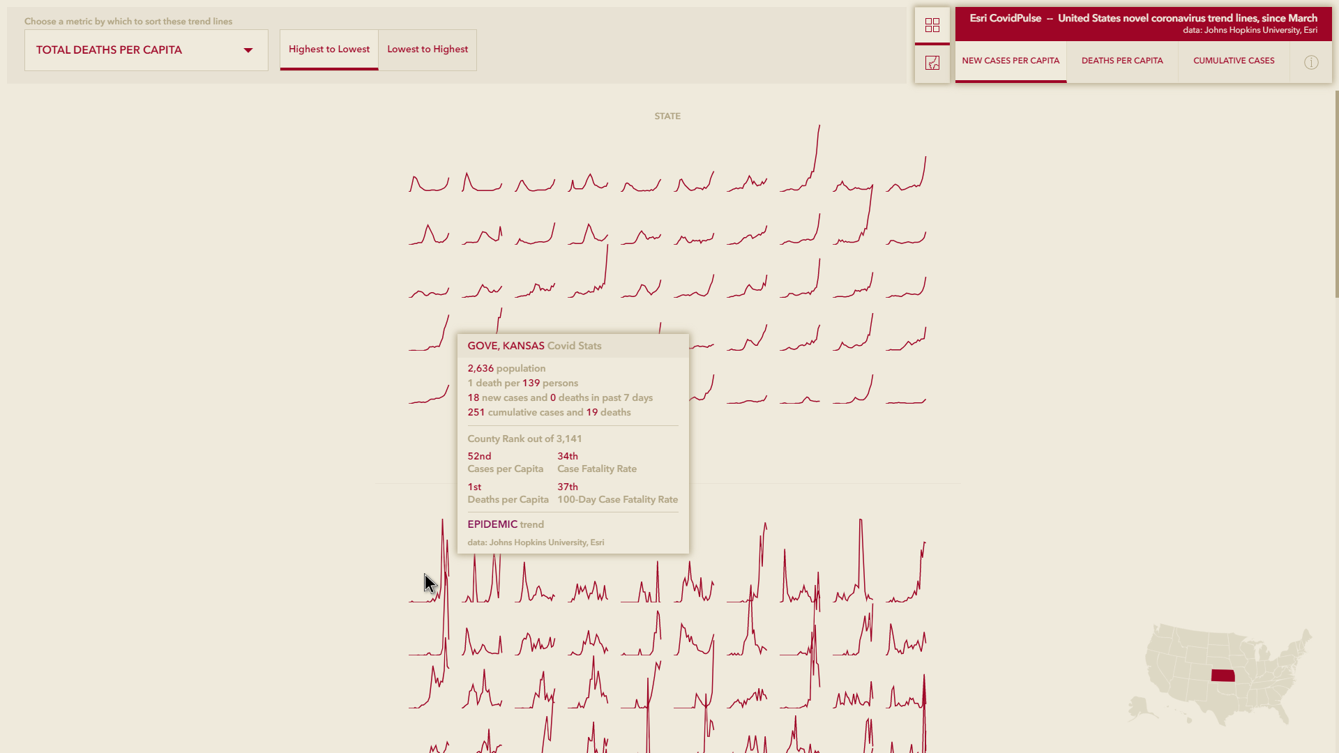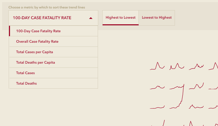 In the Grid View, the trend line graphic options remain the same (new cases per capita, deaths per capita, and cumulative cases), but we’ve provided six ways to sort them: