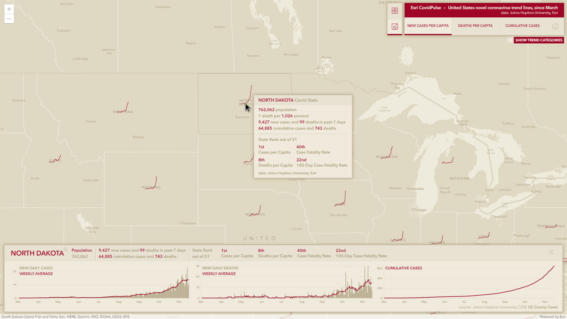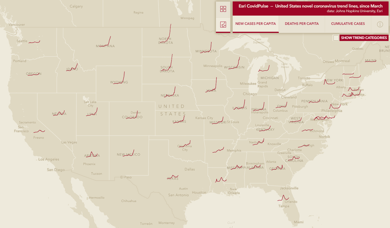 CovidPulse has been updated to provide additional context and value for those looking for local and national trends in the ongoing pandemic. CovidPulse illustrates the local rises and falls of Coronavirus throughout the pandemic via sparkline map symbols, at state and local levels, but now it more readily provides a comparative sense of local rates. In recent weeks we’ve experienced yet another wave of infections in new, and seasonally-driven, parts of the country.